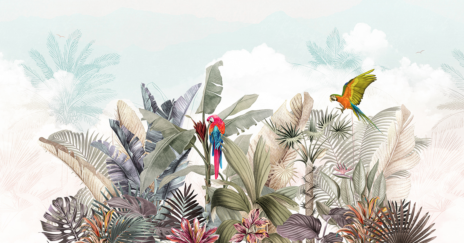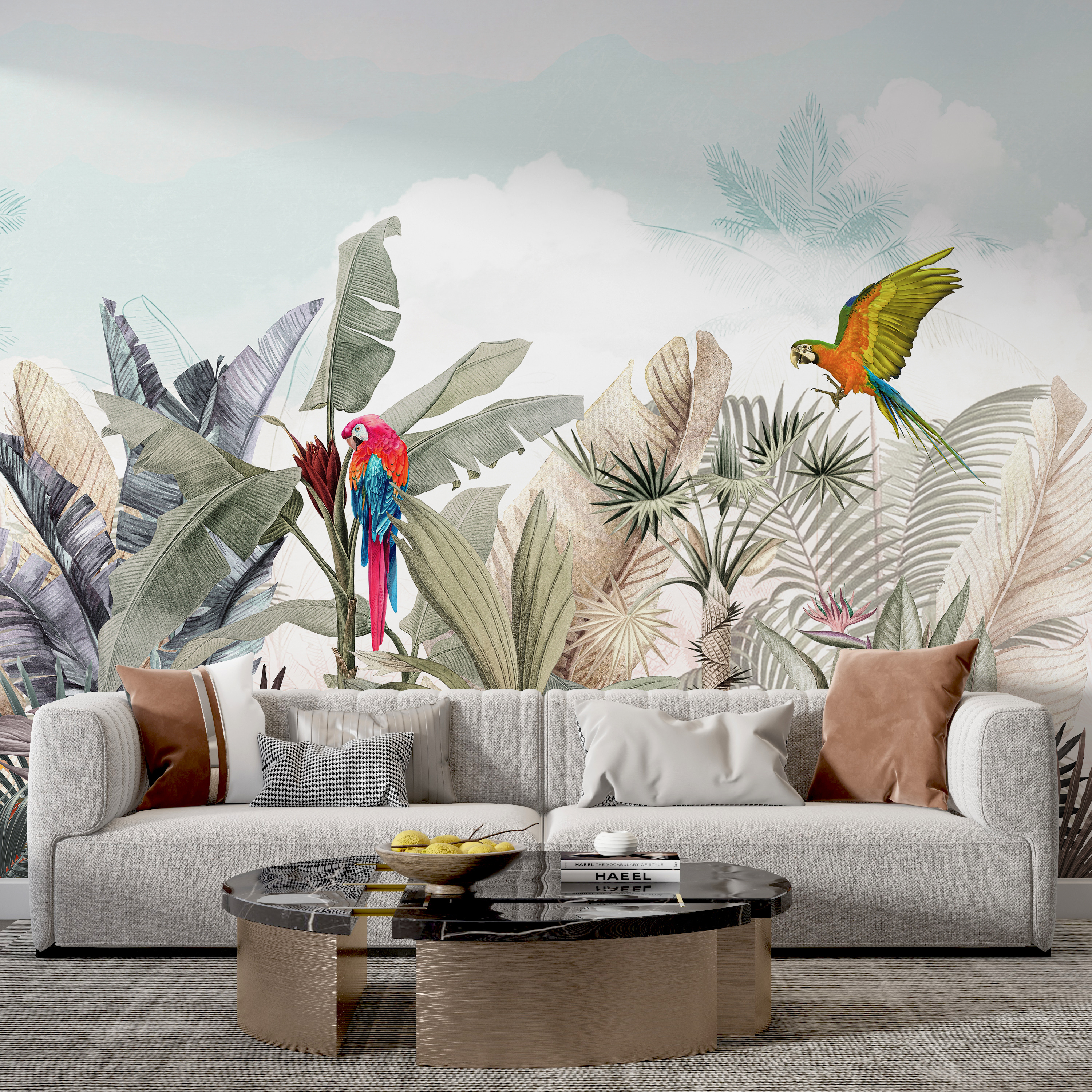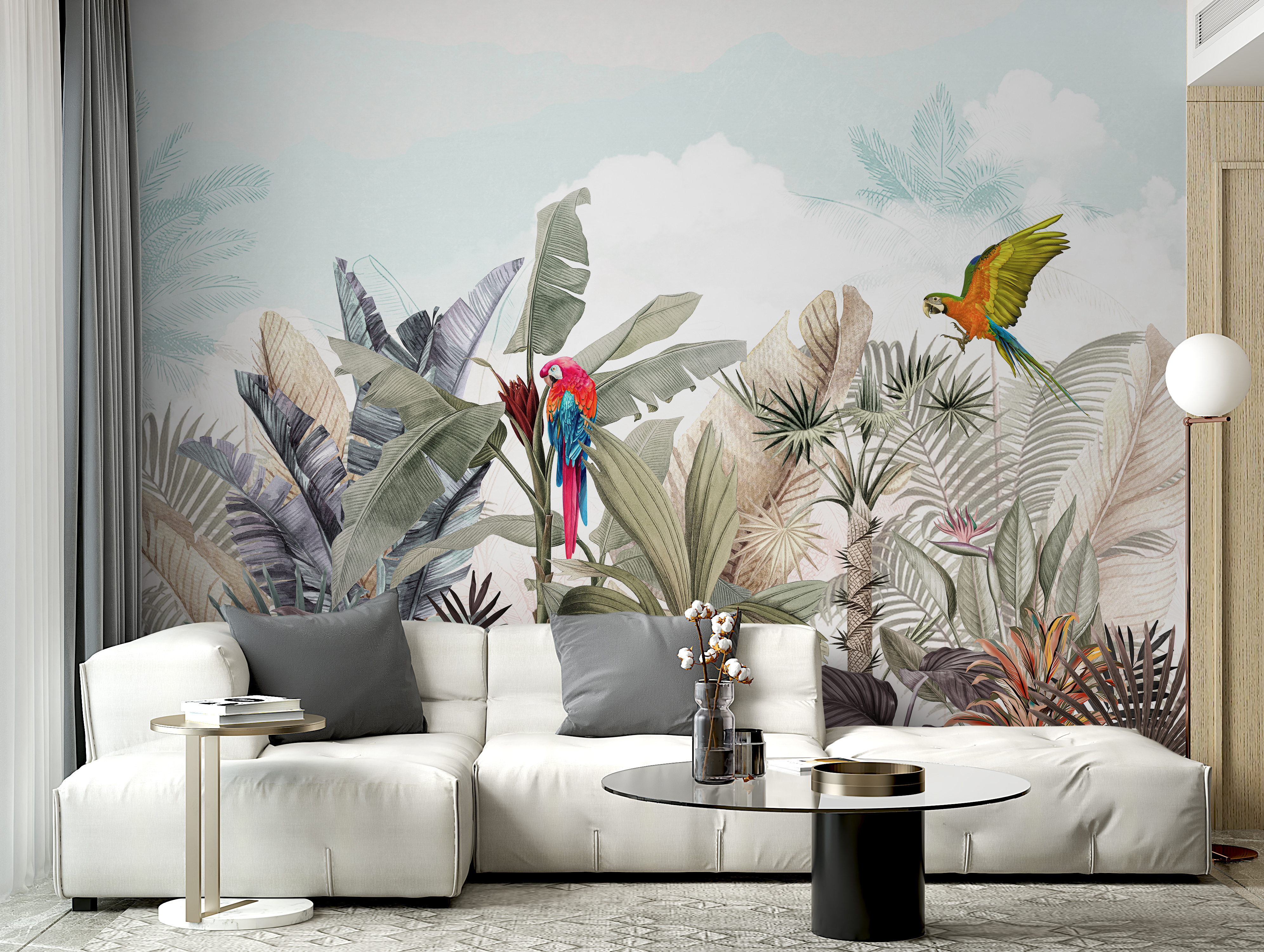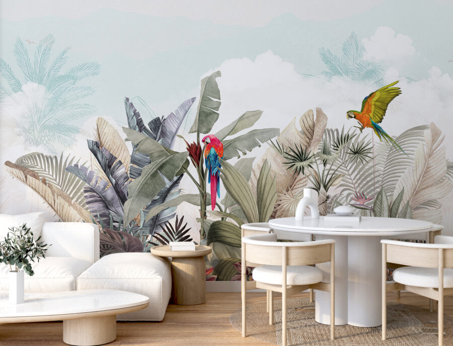 Fă cunoștință cu noua ta obsesie pentru pereți: pictura murală “Papagal colorat zburând în aer”. Este ca și cum ai găsi visul unui ornitolog aterizat chiar în sufrageria ta! Imaginați-vă doi papagali vibranți planând peste frunze verzi și flori tropicale. Este ca o mini-vacanță în pădurea tropicală – fără țânțari, slavă Domnului!