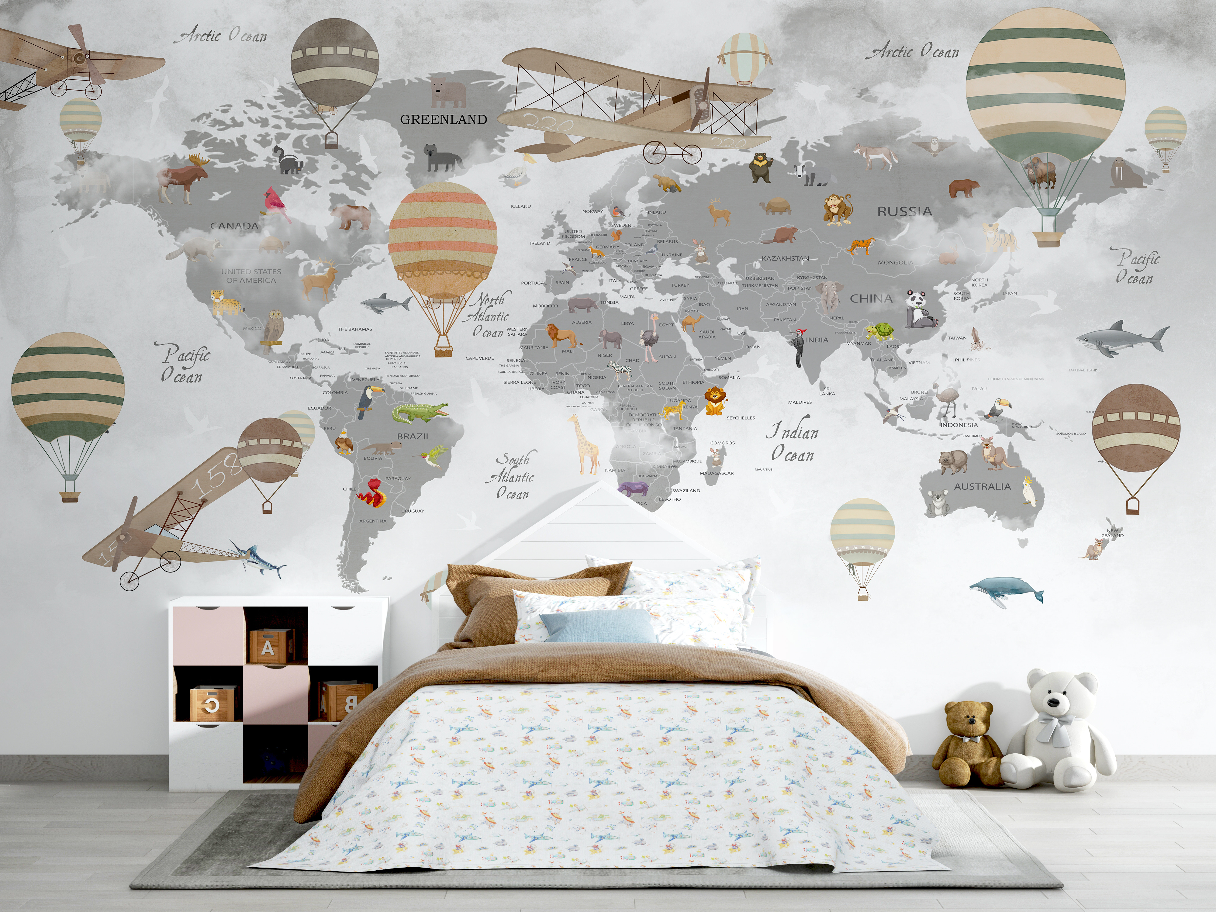Imaginează-ți asta – micul tău aventurier se trezește într-o cameră plină de baloane cu aer cald capricioase plutind deasupra unei hărți vechi! “Balon cu aer cald cu un rechin în fundal” este o pictură murală ciudată și încântătoare, perfectă pentru a stârni curiozitatea. Nu este vorba doar despre geografie; este ca o poveste care așteaptă să se desfășoare. Imaginați-vă povești de culcare despre călătorii în lume, întâlniri cu animale și o privire furișată la rechinul acela obraznic. Ideal pentru copiii care visează mare, transformă orice spațiu într-o rampă de lansare jucăușă pentru imaginație. Este amuzant, educativ și o notă de farmec vintage, toate adunate într-un decor de perete fabulos!