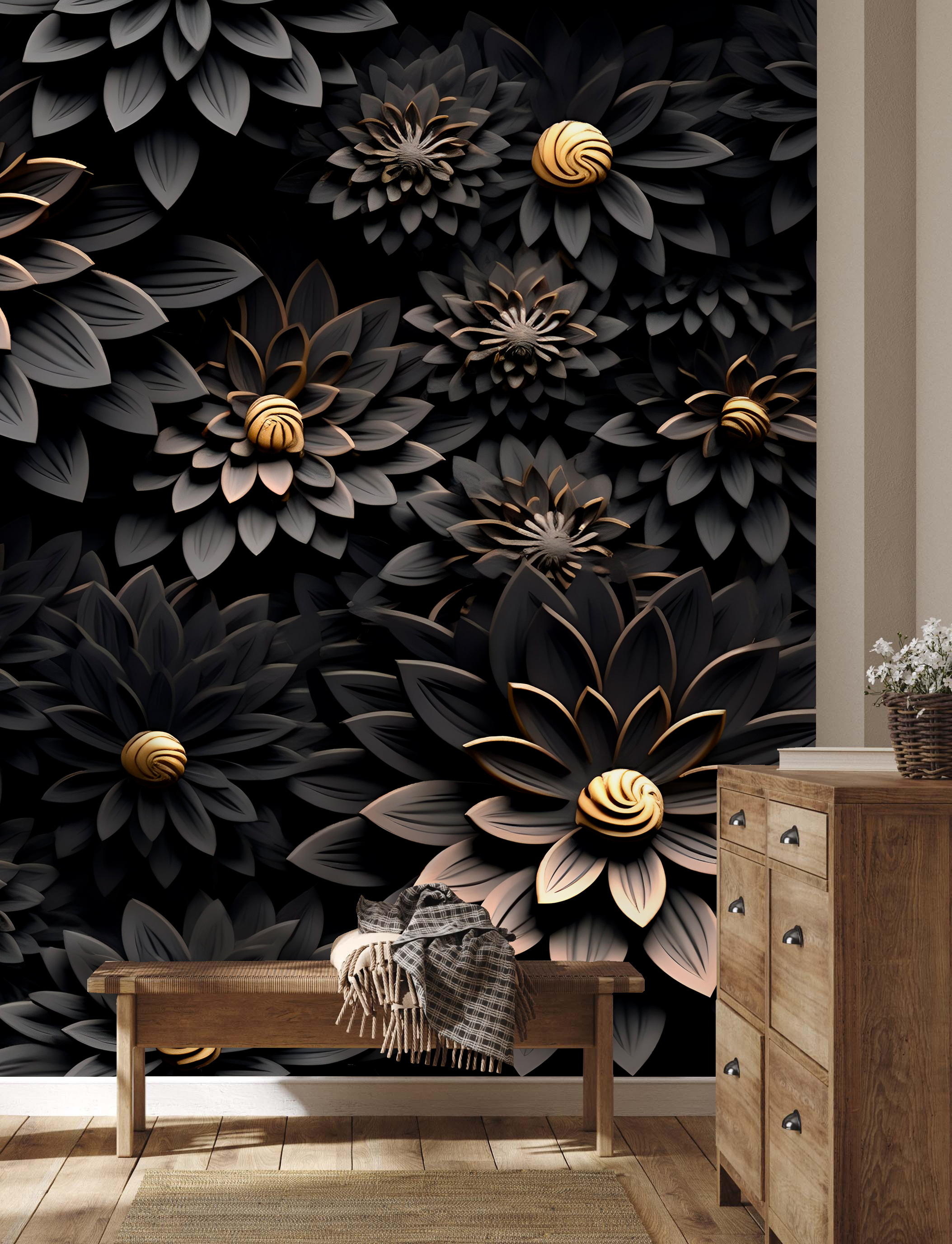 Transformați-vă spațiul cu această pictură murală uimitoare cu flori metalice pe un fundal închis. Este ca și cum ai aduce o bucățică dintr-o grădină magică în interior – perfectă pentru a stârni conversații sau doar pentru a visa cu ochii deschiși într-o după-amiază leneșă. Imaginați-vă acest lucru: sunteți încolăcit cu o carte bună, iar frumusețea acestor flori vă învăluie într-o îmbrățișare confortabilă. Motivele florale ies în evidență în tonurile profunde, adăugând o profunzime intrigantă oricărei încăperi. Nu este doar decor; este o experiență. Imaginați-vă prietenii intrând, zâmbind și simțind instantaneu acel vibe minunat. Un amestec perfect de eleganță și o notă de dramatism, această pictură murală poate transforma orice perete într-o piesă statement și un refugiu vesel.