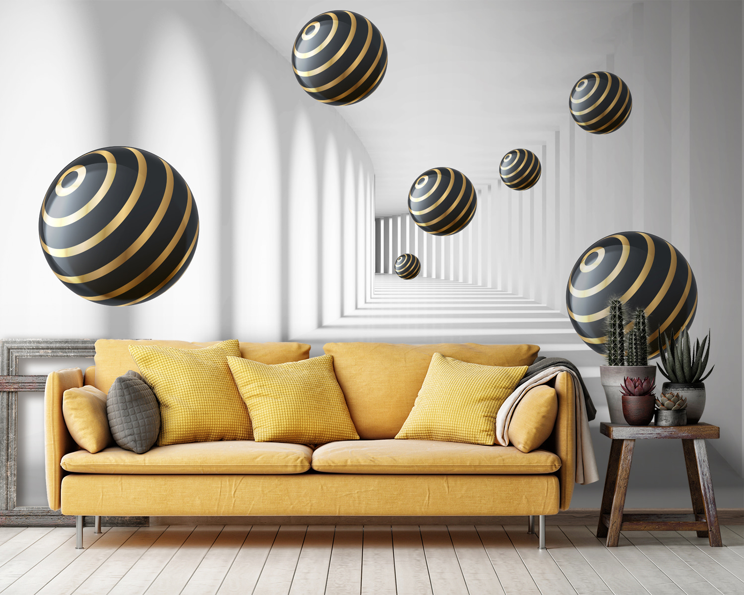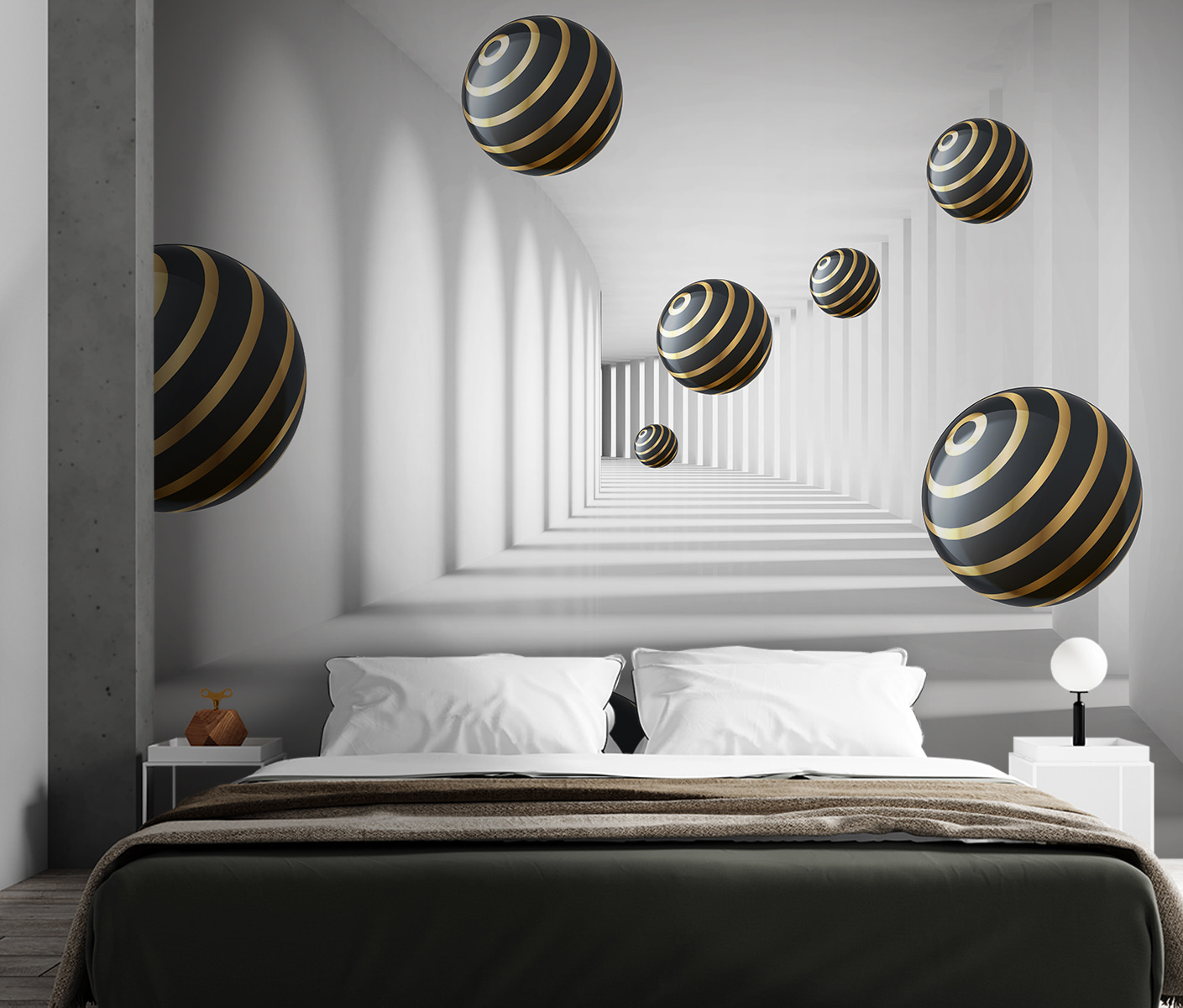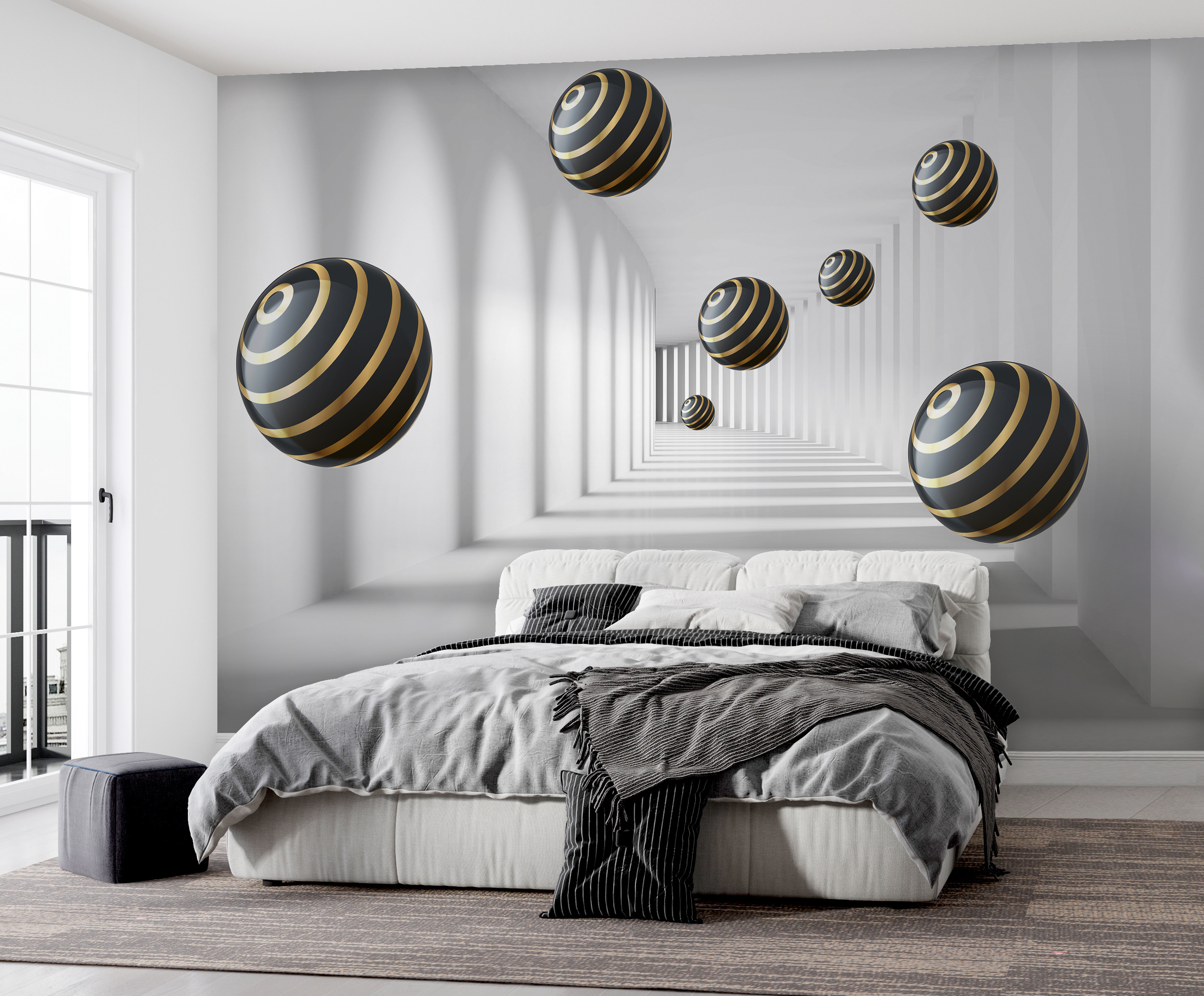 Imaginați-vă că intrați într-o cameră și simțiți că pășiți direct într-o altă dimensiune. Este exact ceea ce face “Fototapet Striped Spheres Hover in White Corridor”. Este un design modern, aproape hipnotic, care vă face să vă simțiți ca într-un tunel futurist. Sferele, cu dungile lor elegante, par să plutească fără efort, creând un sentiment de profunzime care poate face ca spațiul dvs. să pară mai mare. Este ca și cum ai avea propriul tău film SF pe perete!