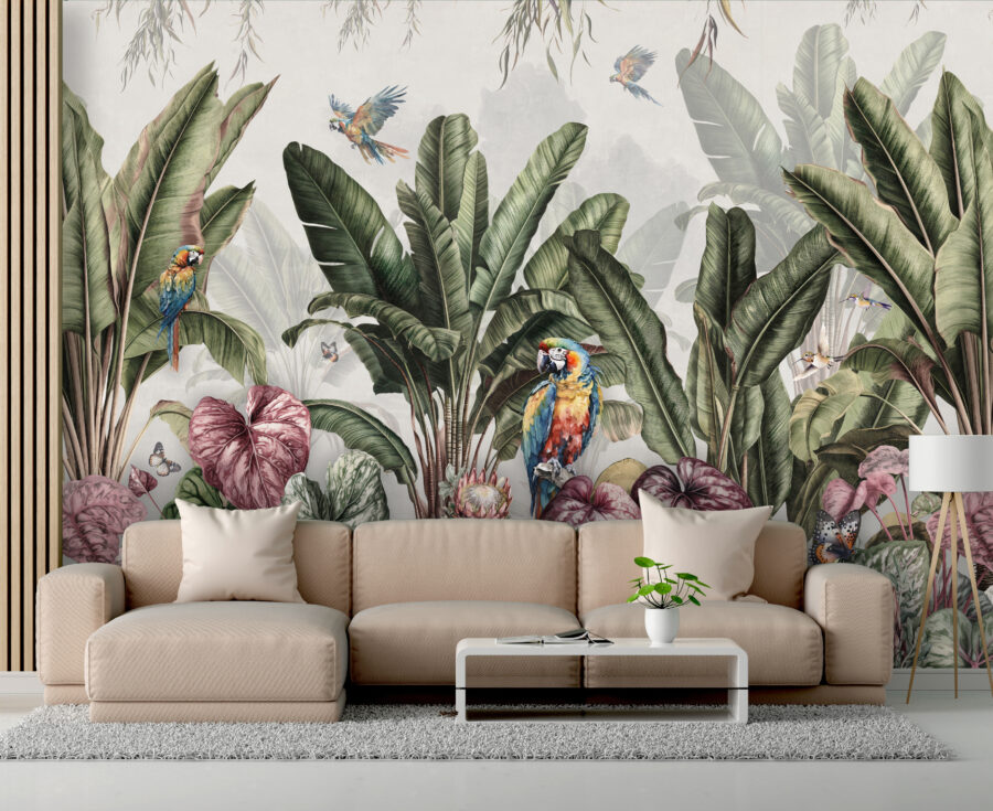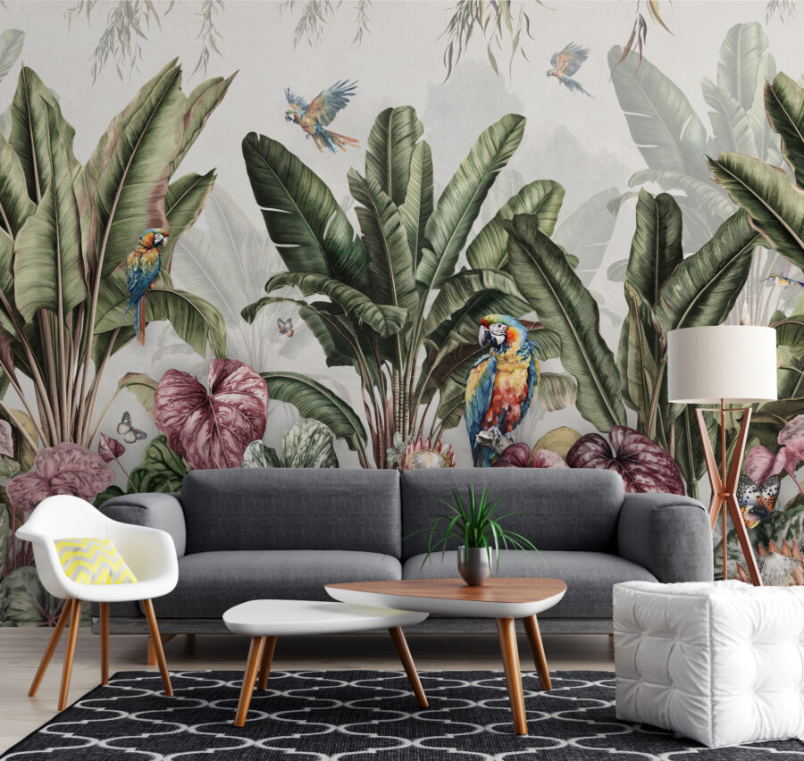 Imaginați-vă că pășiți într-o cameră și vă simțiți instantaneu transportați într-un paradis luxuriant. Este exact ceea ce se întâmplă cu pictura murală “Paradis tropical cu papagali colorați”. Papagali vibranți, plante exotice și fluturi care aproape flutură pe perete – este ca o mini-vacanță fără să vă faceți bagajul! Fie că doriți să înveseliți un spațiu obosit sau să aduceți un pic de fantezie în viața de zi cu zi, această pictură murală vă satisface. Perfectă pentru acele zile ploioase în care un strop de culoare și o atingere a naturii sunt exact ceea ce medicul a recomandat. Gândiți-vă la ea ca la propria dvs. bucată de paradis chiar la dvs. acasă.