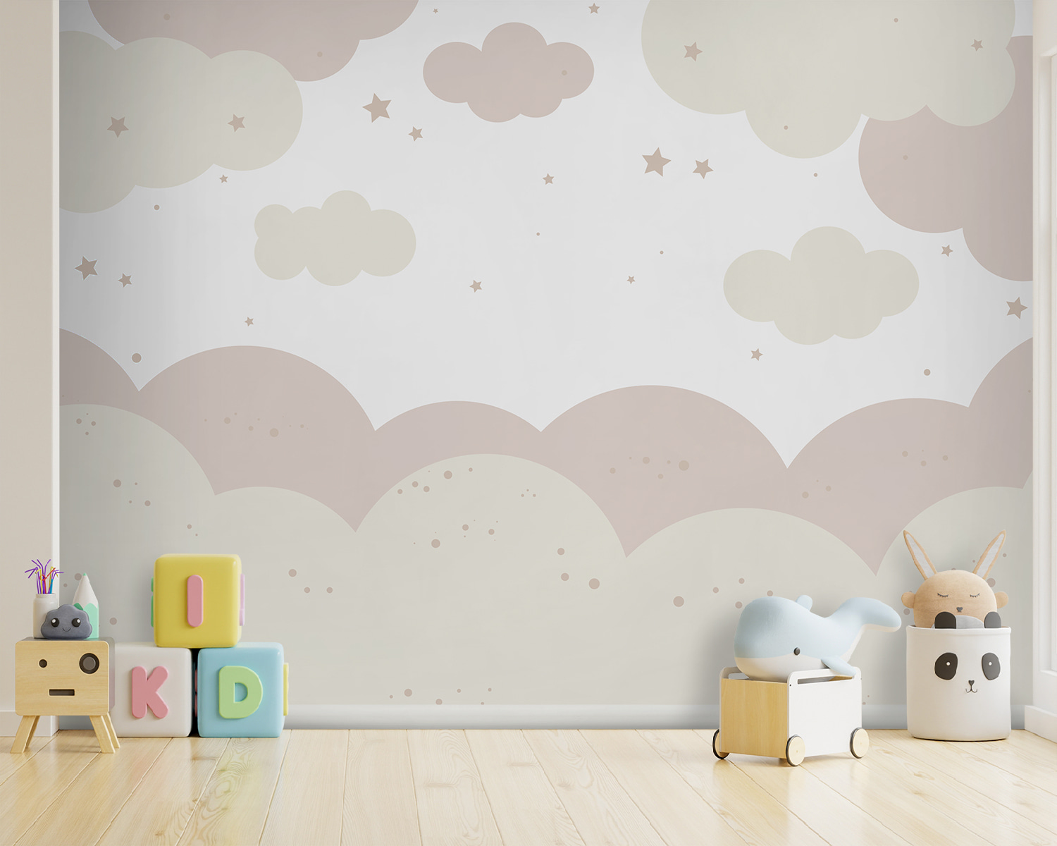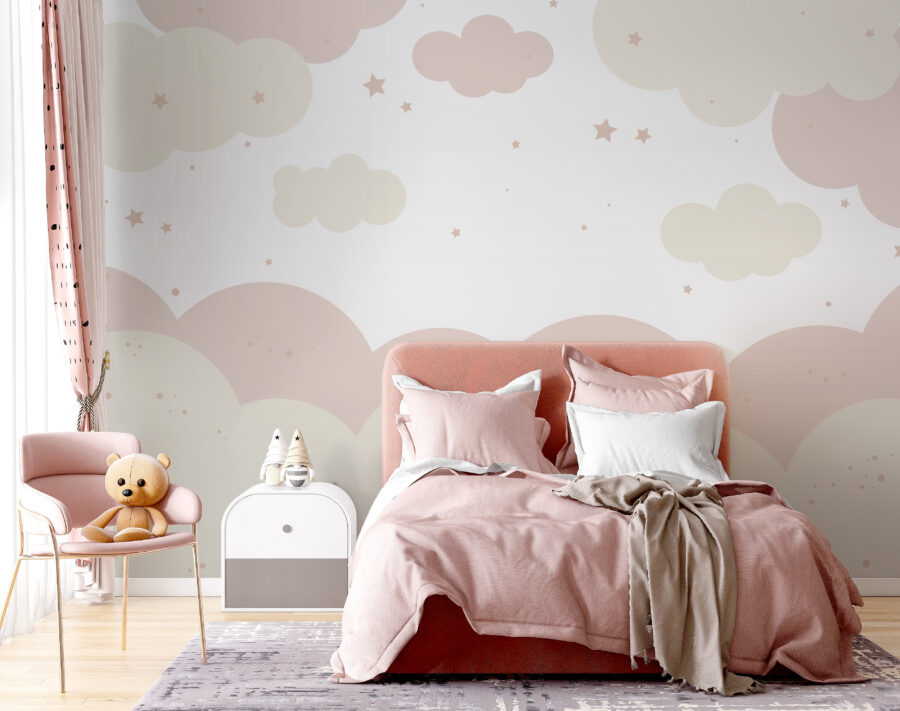 Imaginați-vă că intrați într-o cameră și simțiți seninătatea de a pluti pe nori. Este ceea ce face această pictură murală cu nori albi și roz. Este perfectă pentru camera unui copil – fie că este vorba de o cameră de vis sau de paradisul micuței prințese. Tonurile pastelate sunt liniștitoare, perfecte pentru povești liniștite înainte de culcare sau visări imaginative.