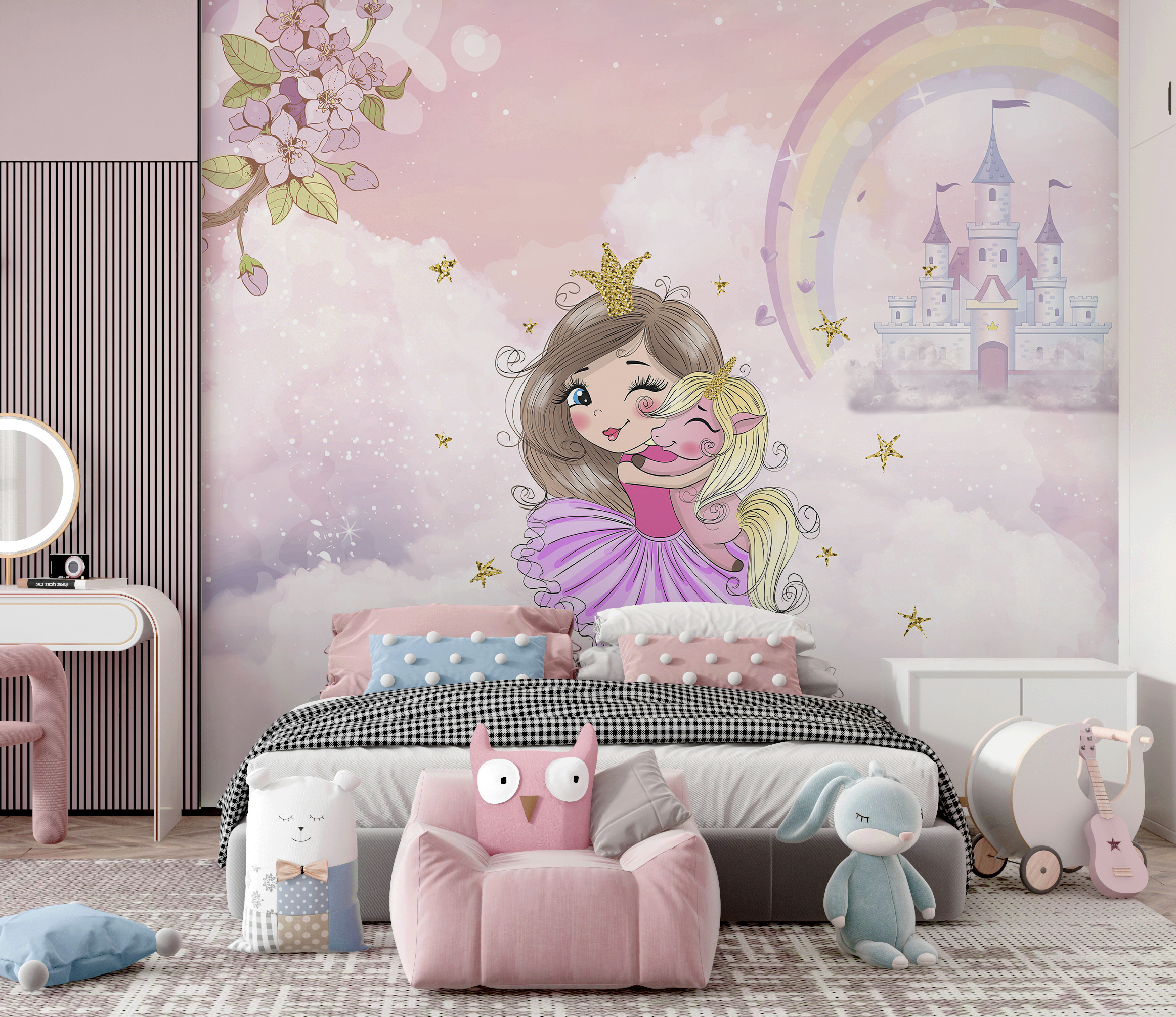 Această pictură murală este magie pură pentru camera oricărui copil! Imaginați-vă o scenă desprinsă dintr-un basm: o fetiță dulce îmbrățișează din suflet cel mai pufos unicorn. Culorile pastelate, stelele sclipitoare și castelul de vis de sub curcubeu – sincer, este ca și cum ai păși într-o carte de povești. Perfect pentru a stârni zâmbete și visări fără sfârșit. În plus, oferă camerei o atmosferă blândă, care este pur și simplu încântătoare. Imaginați-vă-l pe micuțul dvs. trezindu-se în fiecare zi în acest tărâm al minunilor – cu siguranță va face diminețile puțin mai magice.