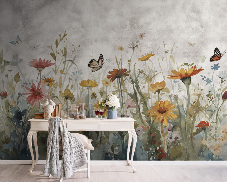 Vreți să vă decorați spațiul? Aruncați o privire la această pictură murală încântătoare, “Fluturii dansează deasupra pajiștilor colorate”. Este ca și cum cineva ar fi îmbuteliat bucuria unei zile însorite pe un câmp de flori sălbatice și ar fi împrăștiat-o direct pe peretele tău! Fluturii care plutesc deasupra florilor strălucitoare reprezintă fericire pură, perfectă pentru oricine ar avea nevoie de puțină magie a naturii în viața sa de interior.