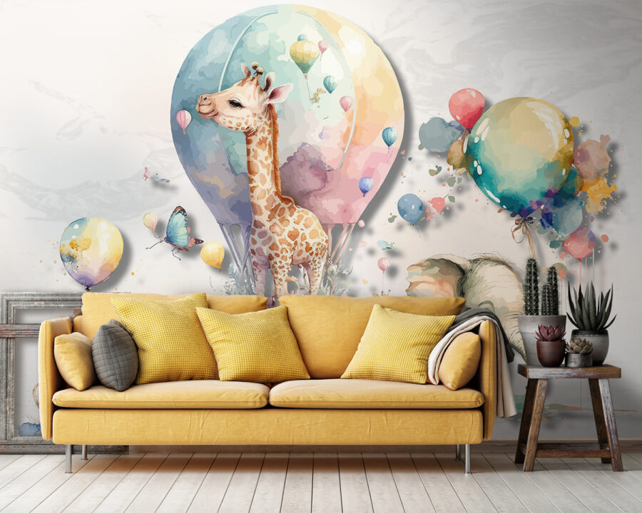 Transformați orice spațiu cu pictura murală încântătoare “Acuarela unui leu”! Această piesă de artă încântătoare prezintă un pui de leu fermecător, o girafă grațioasă care plutește într-un balon cu aer cald și un elefant adorabil care ține baloane colorate – toate pictate în acuarele moi, de vis. Este perfectă pentru a adăuga o notă de fantezie camerelor pentru copii, zonelor de joacă sau oricărui loc care are nevoie de un strop de magie.
