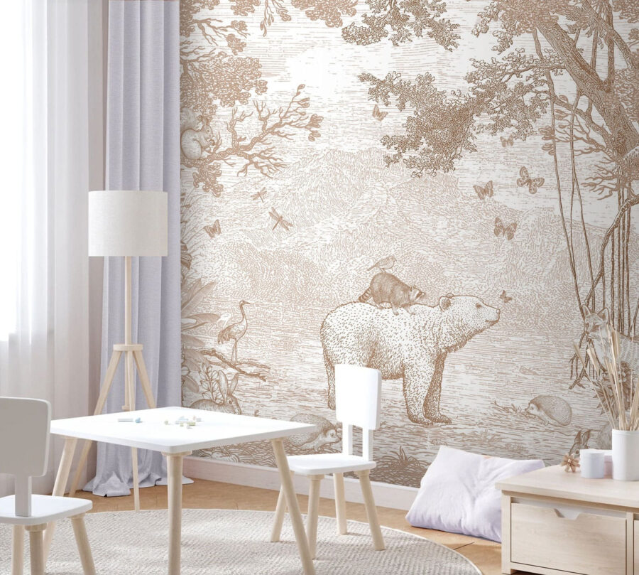 Imaginați-vă asta: un raton fermecător cocoțat fericit pe spatele unui urs, înconjurat de prietenii din pădure. Această pictură murală, perfectă pentru camera oricărui copil, seamănă cu o pagină desprinsă direct dintr-o carte de povești fermecătoare. Tonurile stinse, sepia, îi conferă un aer atemporal, făcându-l liniștitor și primitor – ca o îmbrățișare blândă pentru ochi. Va stârni povești nesfârșite înainte de culcare și imaginații jucăușe. Imaginează-ți ochii micuțului tău luminându-se în fiecare seară. Un fundal perfect pentru ora de joacă, ora de somn și toate momentele confortabile dintre ele. Captivant, capricios și atât de adorabil!