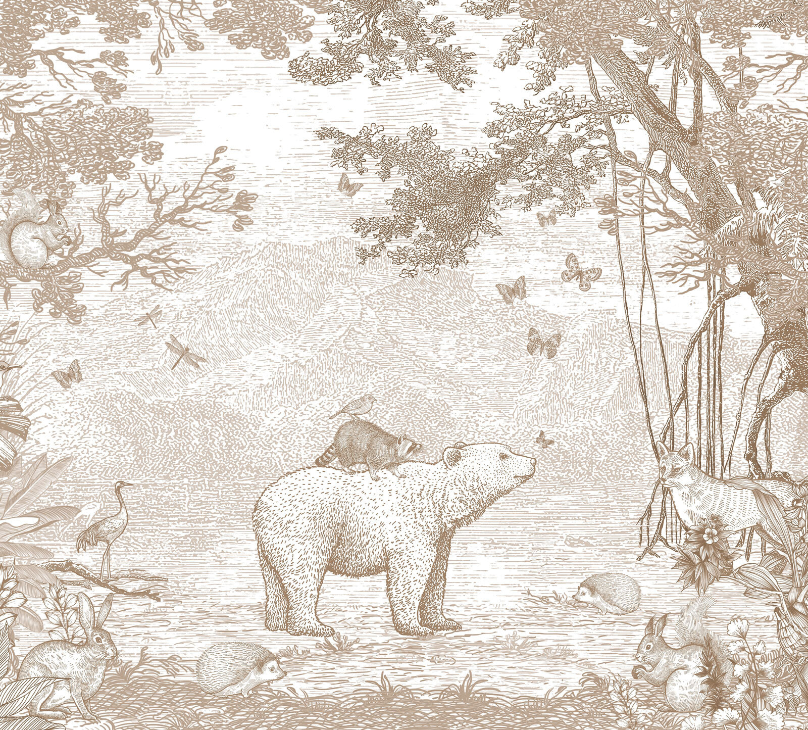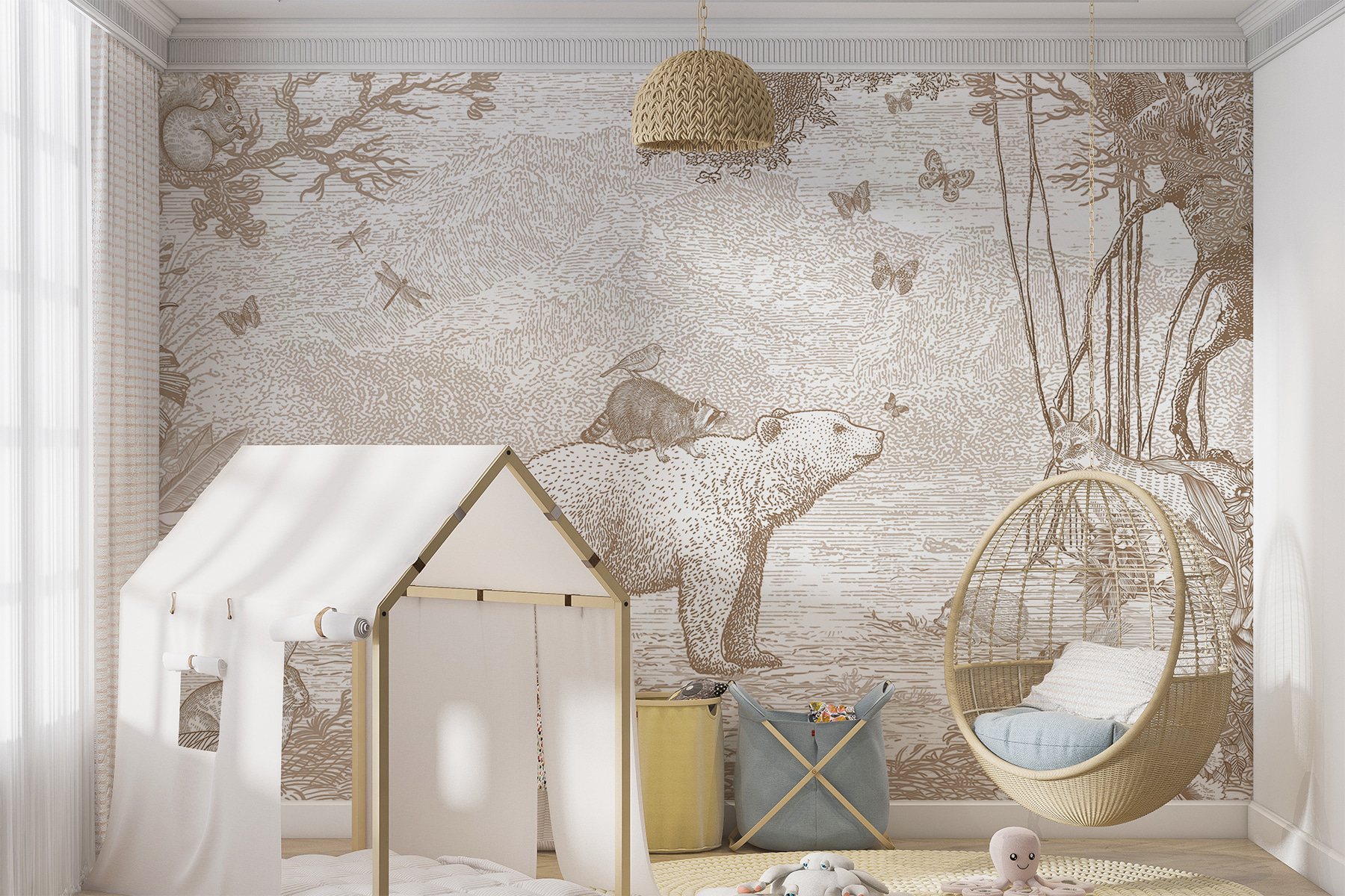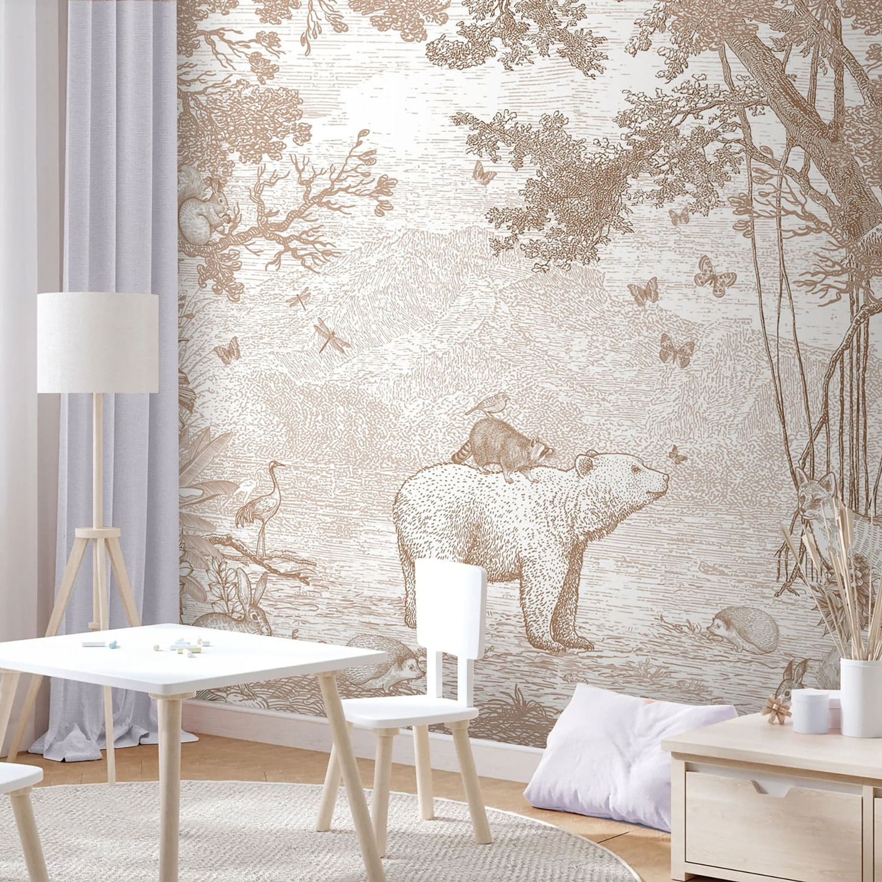 Imaginați-vă asta: un raton fermecător cocoțat fericit pe spatele unui urs, înconjurat de prietenii din pădure. Această pictură murală, perfectă pentru camera oricărui copil, seamănă cu o pagină desprinsă direct dintr-o carte de povești fermecătoare. Tonurile stinse, sepia, îi conferă un aer atemporal, făcându-l liniștitor și primitor – ca o îmbrățișare blândă pentru ochi. Va stârni povești nesfârșite înainte de culcare și imaginații jucăușe. Imaginează-ți ochii micuțului tău luminându-se în fiecare seară. Un fundal perfect pentru ora de joacă, ora de somn și toate momentele confortabile dintre ele. Captivant, capricios și atât de adorabil!