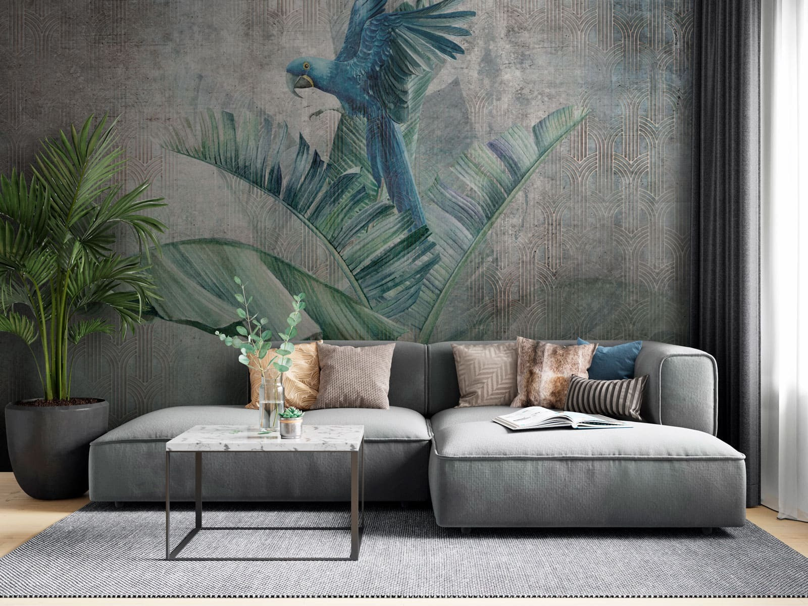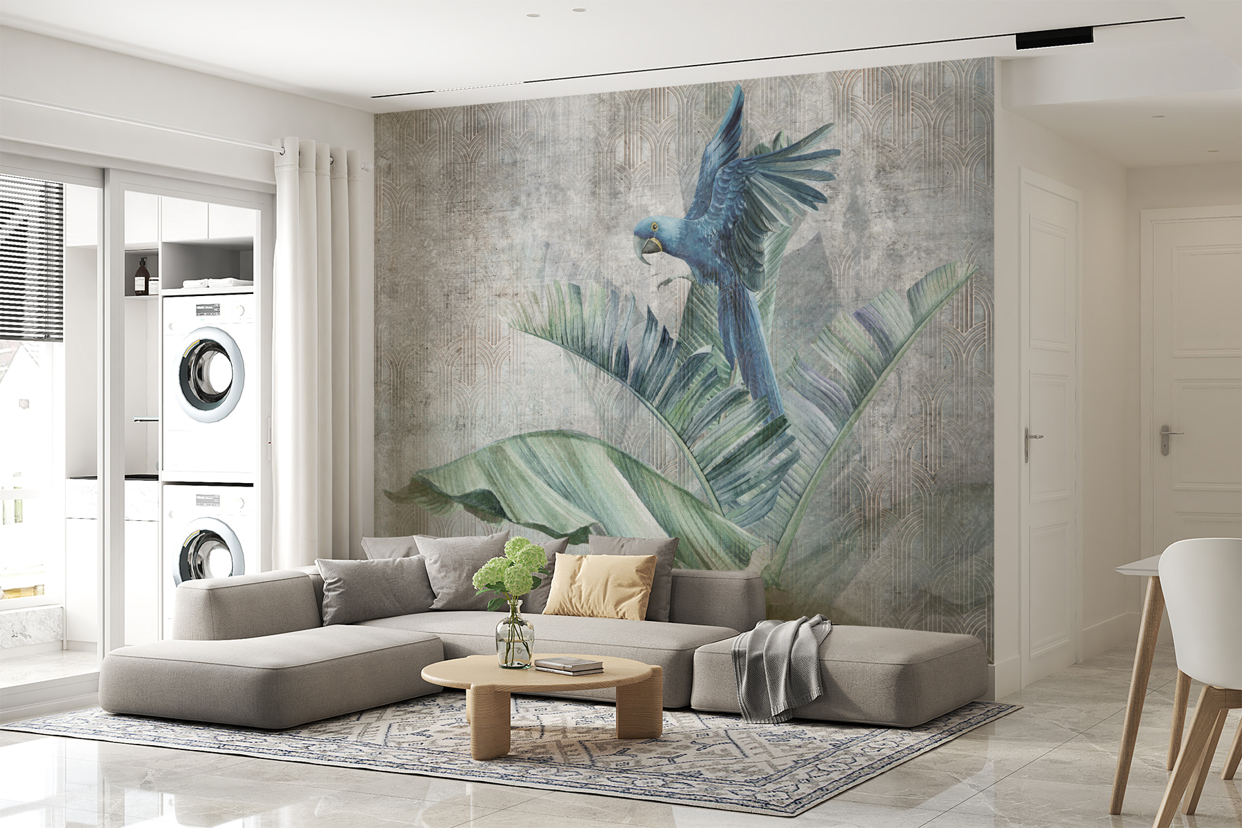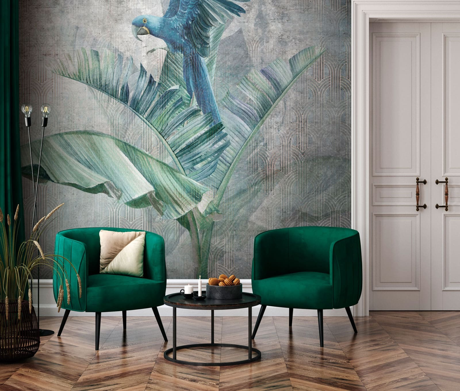 Imaginați-vă că intrați în sufragerie și sunteți întâmpinați de un papagal albastru uimitor cocoțat pe ramuri luxuriante, cu frunze. Această pictură murală este mai mult decât un simplu decor – este o evadare tropicală. Albastrul vibrant al papagalului iese în evidență pe un fundal de verde liniștitor, făcând ca spațiul dvs. să se simtă ca o oază de pădure tropicală. Este perfect pentru oricine iubește păsările sau are nevoie de un pic mai multă natură în viața sa. Imaginați-vă-o în sufragerie, adăugând un aer proaspăt cafelei de dimineață sau invitaților la cină, complimentându-vă stilul unic. În plus, are atingerea potrivită de eleganță, cu acele frunze de palmier care încadrează scena. De ce să vă mulțumiți cu pereți simpli când puteți avea o operă de artă care vă transportă în fiecare zi într-un paradis tropical?