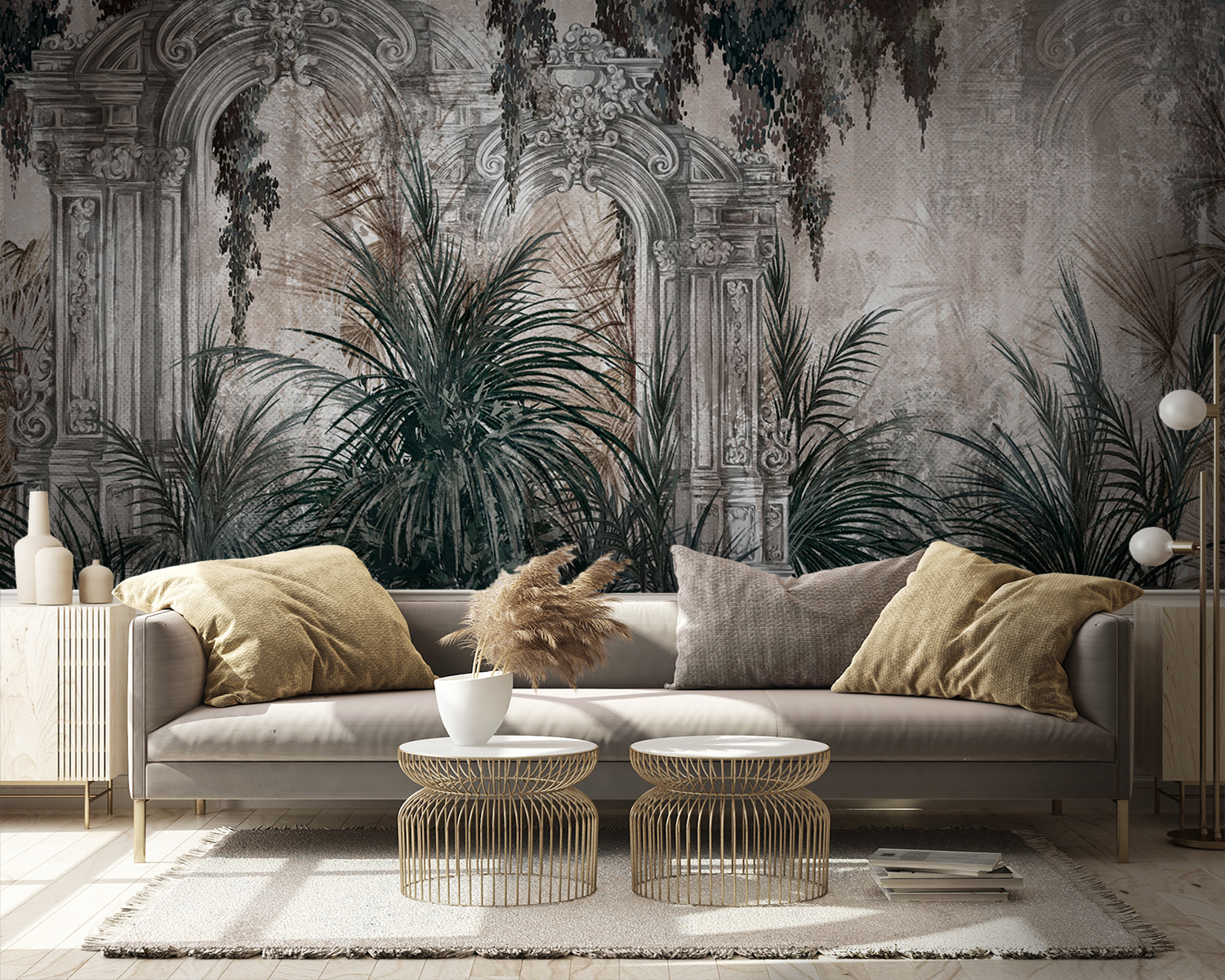 Transformarea unui spațiu într-un paradis tropical este mai ușoară cu această pictură murală uimitoare. Imaginați-vă că pășiți într-o junglă luxuriantă chiar din camera dvs. de zi – această operă de artă vă invită să evadați din realitate, chiar dacă doar pentru o clipă. Arcul detaliat încadrează o scenă vegetală frumoasă, îmbinând fără efort eleganța cu natura. Este ca și cum ai avea o bucată personală de paradis pe peretele tău! Imaginați-vă prietenii admirând-o, comentând despre modul în care luminează instantaneu atmosfera. Perfect pentru cei care iubesc o notă de sălbăticie fără întreținerea plantelor adevărate. Cine ar fi crezut că arta murală poate stârni atâta bucurie?