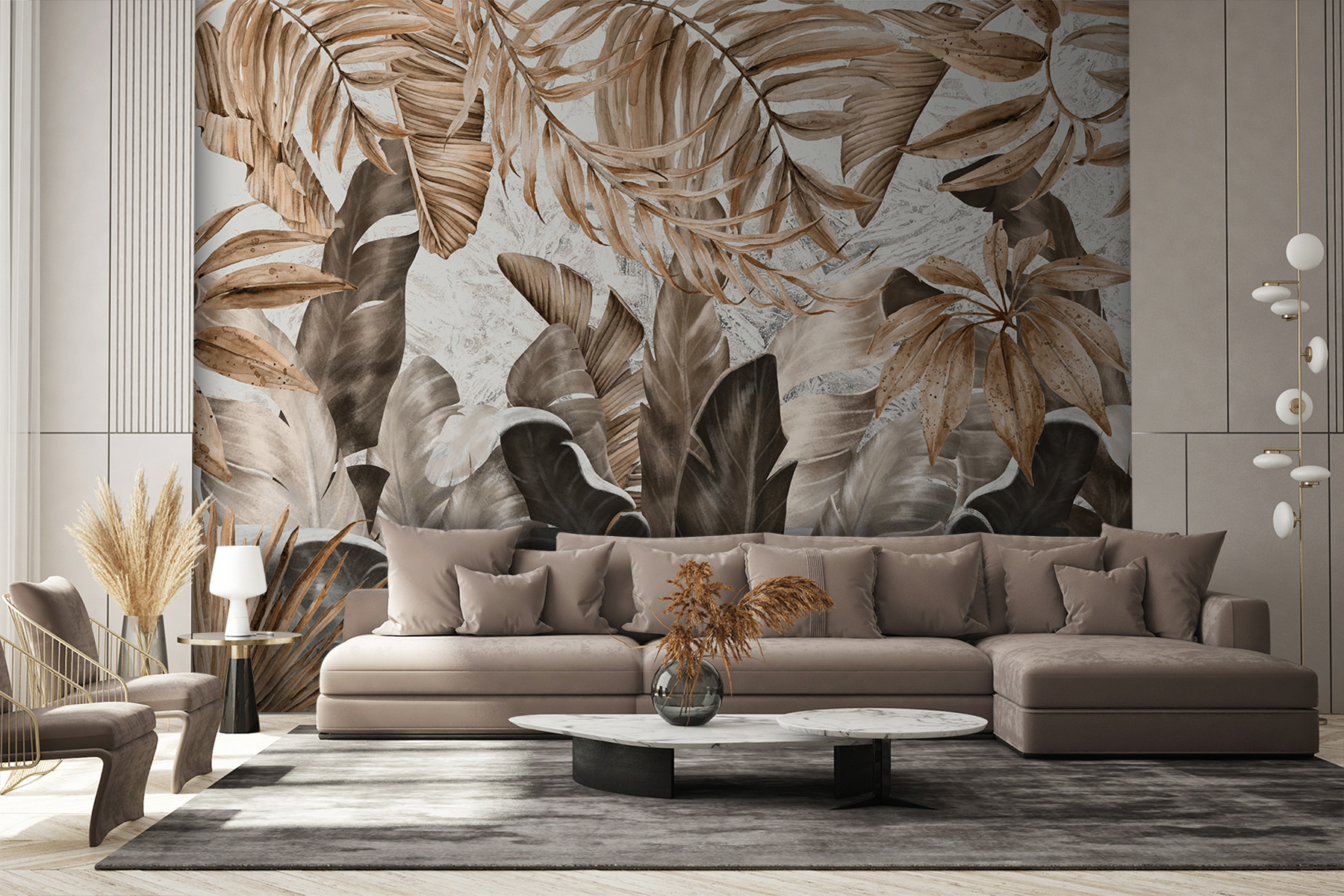 Imaginați-vă că intrați în sufragerie și simțiți că ați fost transportat într-un paradis tropical senin. Acest perete mural “Frunze tropicale în tonuri pământii” face exact asta. Are aceste frunze uimitoare, supradimensionate, cu nuanțe bogate, pământii, care aduc o atingere a naturii chiar în casa ta. Acesta nu este doar un tapet la modă – este o piesă statement, aproape ca și cum ai avea o piesă uriașă și frumoasă de artă modernă lipită pe perete.