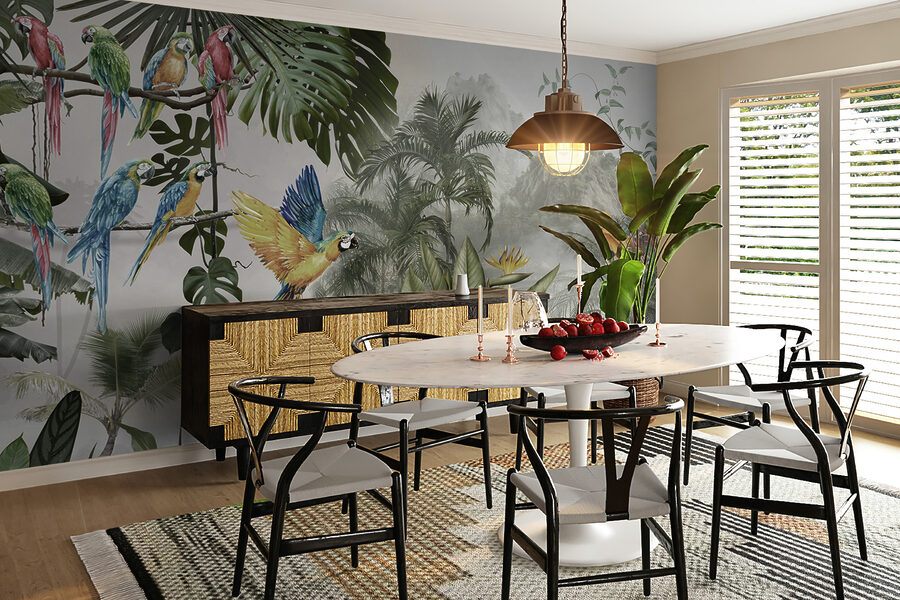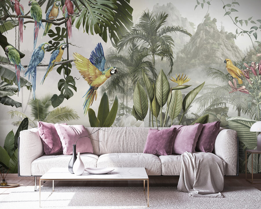 Transformați orice perete într-o evadare vibrantă cu această pictură murală uimitoare de papagali colorați în plin zbor. Imaginați-vă că intrați într-o cameră în care acești prieteni cu pene par să zboare prin aer, fiecare ciripit fiind ecoul farmecului unui paradis tropical. Este ca și cum ai aduce o parte din natură înăuntru, mai puțin umiditatea. Frunzele luxuriante și florile vibrante o fac să pară vie, creând acest fundal de vis care stârnește bucurie și căldură.