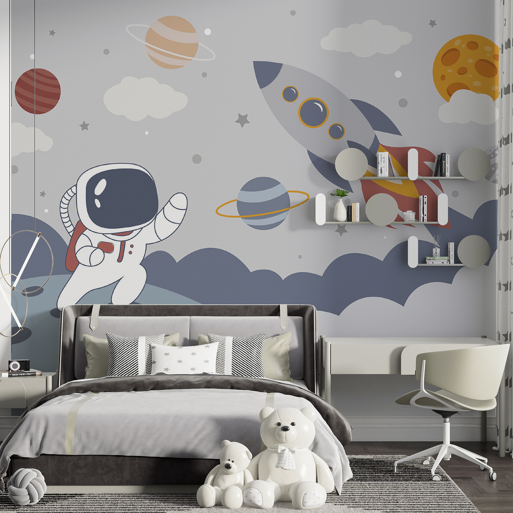 Transformarea spațiului unui copil într-o aventură cosmică este la fel de ușoară ca această pictură murală cu un astronaut fermecător și planete vibrante. Imaginați-vă un micuț privind această scenă ieșită din comun, visând la călătorii în spațiu și escapade intergalactice. Designul jucăuș aduce o doză de imaginație, perfect pentru a stârni curiozitatea față de univers. Inelele colorate și norii capricioși invită la vise cu ochii deschiși și la călătorii de poveste, făcând ca ora de culcare să fie mai puțin obișnuită. Nu este doar o decorațiune; este o poartă către o galaxie a minunilor și a bucuriei!
