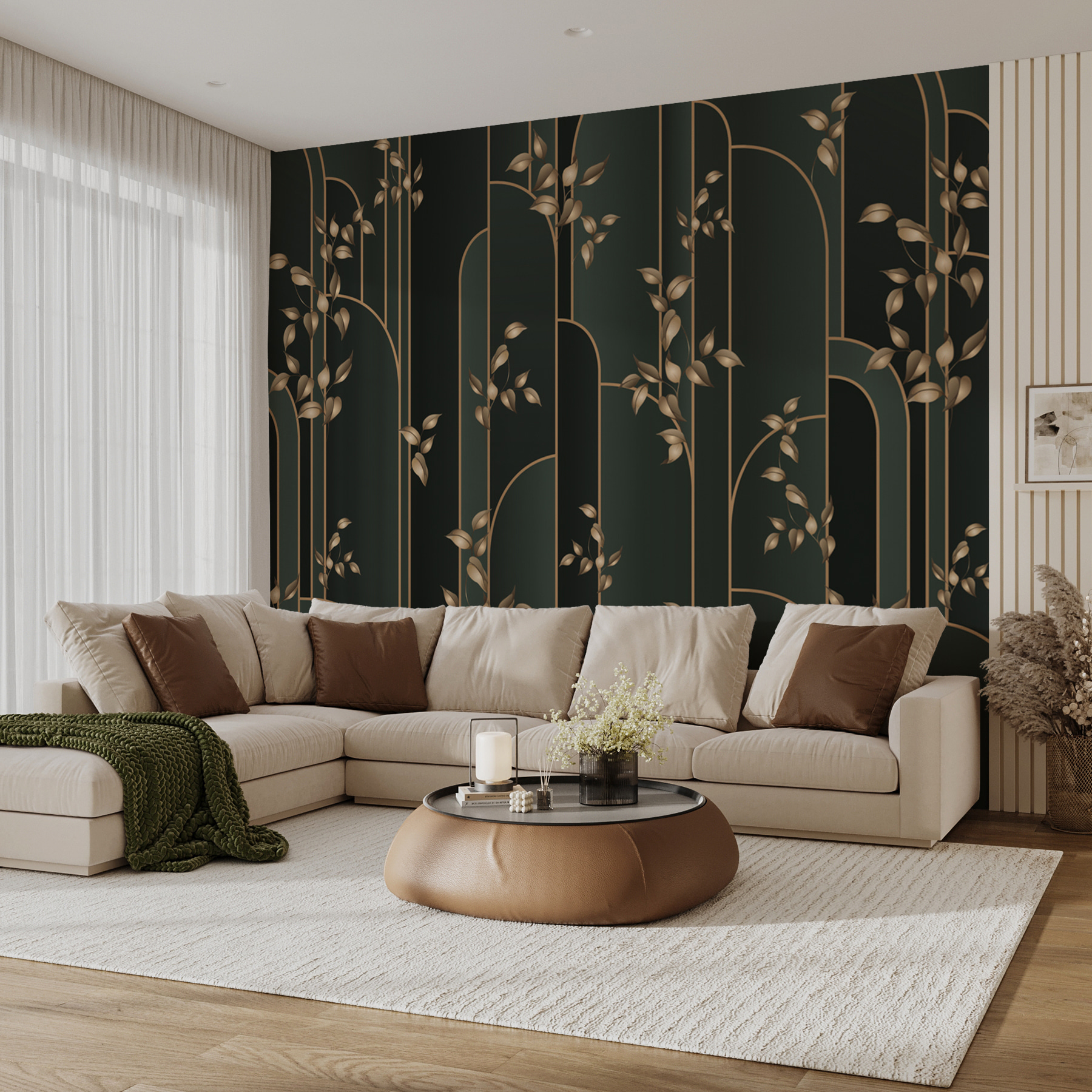 Transformați orice cameră într-o oază confortabilă cu această pictură murală cu frunze elegante pe un fundal cu dungi întunecate. Este ca și cum ai aduce o pădure senină chiar în casa ta – nu sunt necesare cizme de drumeție! Imaginați-vă acest lucru: pășind într-o cameră de zi sau un dormitor care se simte în același timp răcoritor și sofisticat. Designul cu frunze adaugă un strop de natură fără mizerie, iar fundalul bogat face ca detaliile să iasă în evidență. Prietenii se vor întreba dacă aveți o grădină secretă ascunsă. Perfect pentru oricine dorește să adauge o notă de stil și un pic de calm spațiului său!