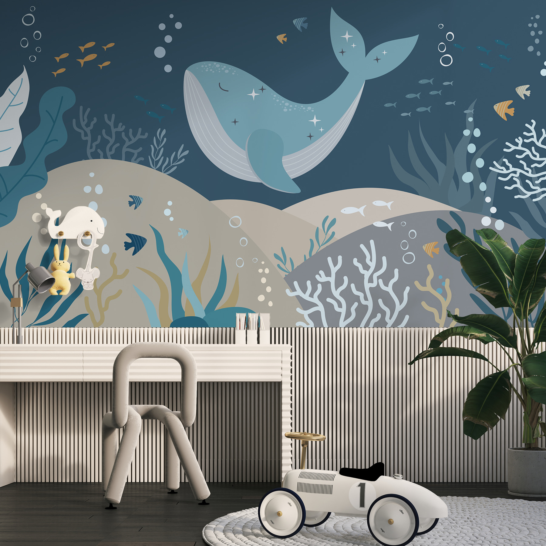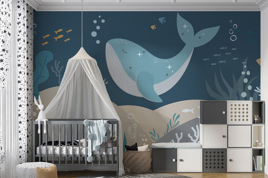 Uitați-vă la această pictură murală capricioasă, “Balena albastră cu stele și pești”. Serios, este ca și cum te-ai scufunda într-un tărâm de vis subacvatic! Perfectă pentru o cameră de copii, imaginați-vă o balenă albastră plutind ușor în derivă, presărată cu stele sclipitoare, înconjurată de pești jucăuși. Nu fi surprins dacă cei mici se pierd în propriile lor aventuri oceanice. Tonurile albastre suave sunt ca o îmbrățișare calmă – ah, atât de liniștitoare. Transformați ora de culcare într-o călătorie magică pe mare în fiecare seară cu această pictură murală încântătoare. Este ca și cum ai aduce o bucată de ocean chiar în casa ta!