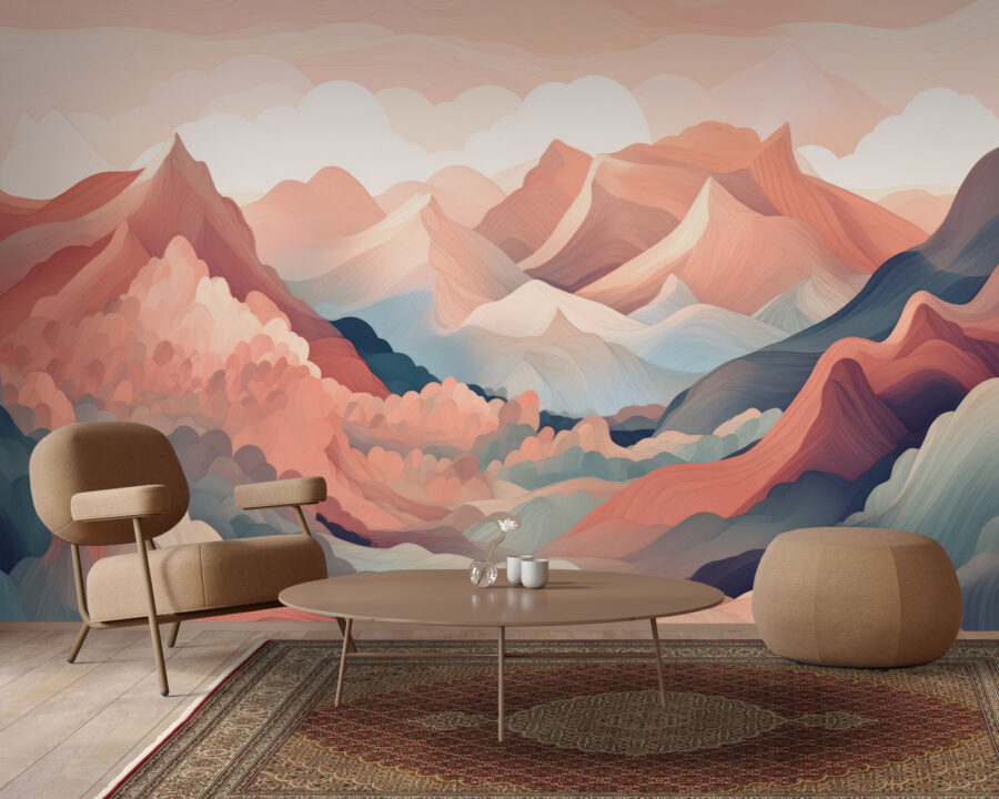 Simțiți că pereții dvs. au nevoie de o explozie de viață? Aruncați o privire la această pictură murală “Peisaj montan colorat”! Nu este doar un decor tipic – vorbim despre o aventură pentru simțuri chiar în sufrageria dvs. Imaginați-vă că vă relaxați pe canapea, privind culmile pastelate și desenele în vârtej care practic vă invită să visați cu ochii deschiși. Este ca o mini-călătorie pe un tărâm îndepărtat, fără a ieși din casă.