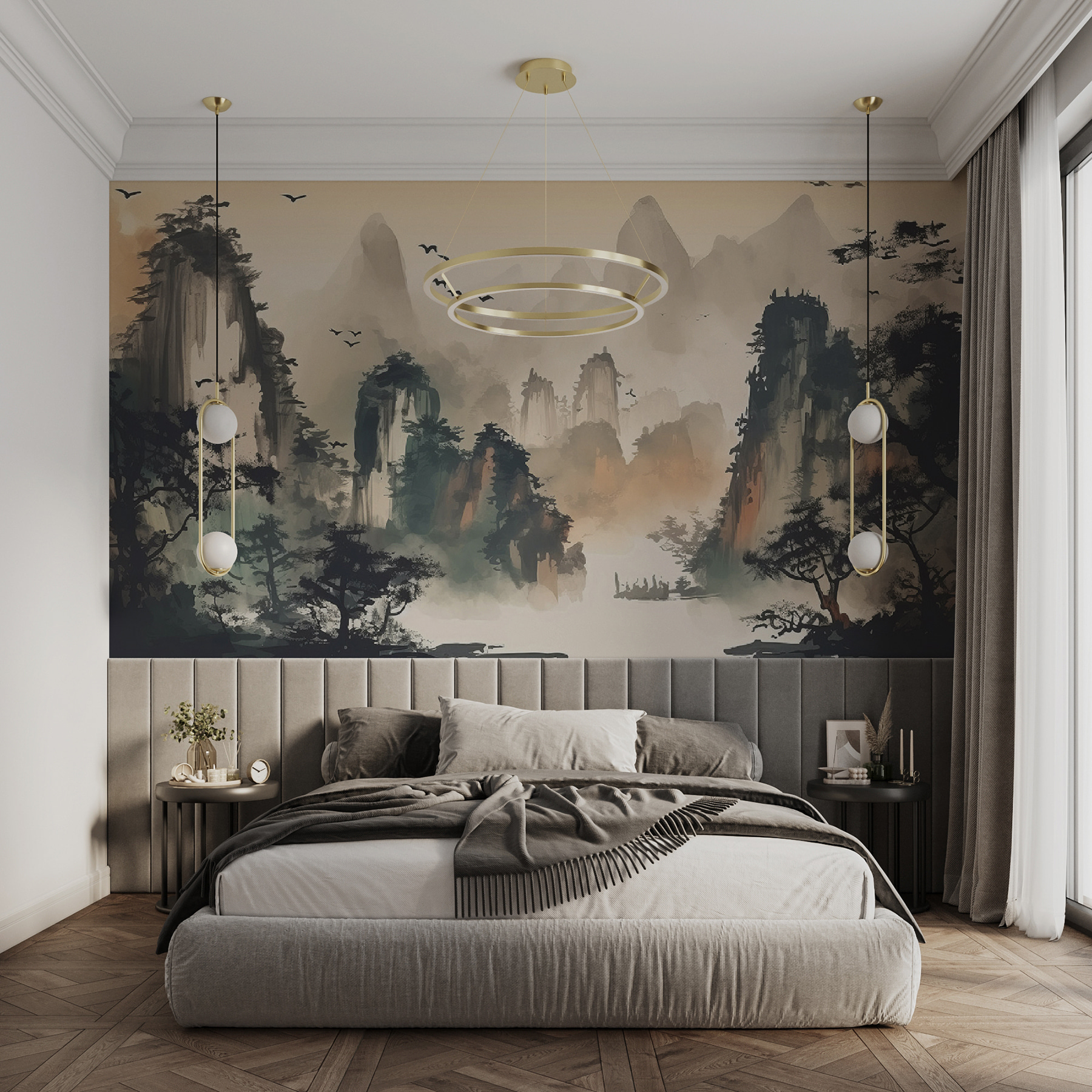 Imaginați-vă că intrați într-o cameră confortabilă cu această pictură murală încântătoare, “Pictură murală de copaci și munți”, care vă întâmpină. Este ca și cum ai păși direct într-un peisaj senin în care munții cețoși și copacii șoptitori devin evadarea ta zilnică. Perfectă pentru o cameră de zi sau chiar pentru un spațiu de meditație liniștită – cine nu și-ar dori o mică felie de natură în interior? Nuanțele blânde și cețoase creează o atmosferă liniștitoare, aproape ca și cum munții ar îmbrățișa camera ta cu o îmbrățișare mare și caldă. Iar păsările care zboară prin cameră dau senzația că prin ea trece o briză ușoară. Prietenii vor trece pe aici? Vor fi uimiți, probabil imaginându-și că se află într-o drumeție printr-o pădure senină și mistică – mai puțin picioarele dureroase. Această pictură murală face din peretele tău nu doar un perete, ci o călătorie. Așa că dați-i drumul, lăsați locuința dvs. să spună o poveste, cu câte o scenă uimitoare.