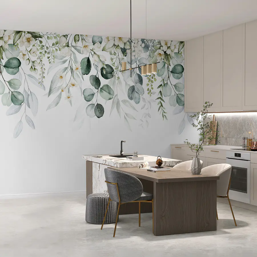 Imaginați-vă că pășiți într-o cameră împodobită cu eleganța încântătoare a florilor delicate și a frunzelor verzi și moi. Această pictură murală transformă fără efort orice spațiu într-o evadare senină. Imaginați-vă după-amieze leneșe petrecute cu o carte, în timp ce culorile blânde vă cuprind într-o îmbrățișare liniștitoare. Perfectă pentru un colț confortabil sau o zonă de luat masa aerisită, aceasta invită vibrații odihnitoare și un strop de natură în interior. Prietenii vor intra și, pur și simplu, conversația se va îndrepta spre escapade botanice fericite. Nu este doar tapet; este o stare de spirit. Cine ar fi crezut că un perete poate aduce atâta căldură și farmec?