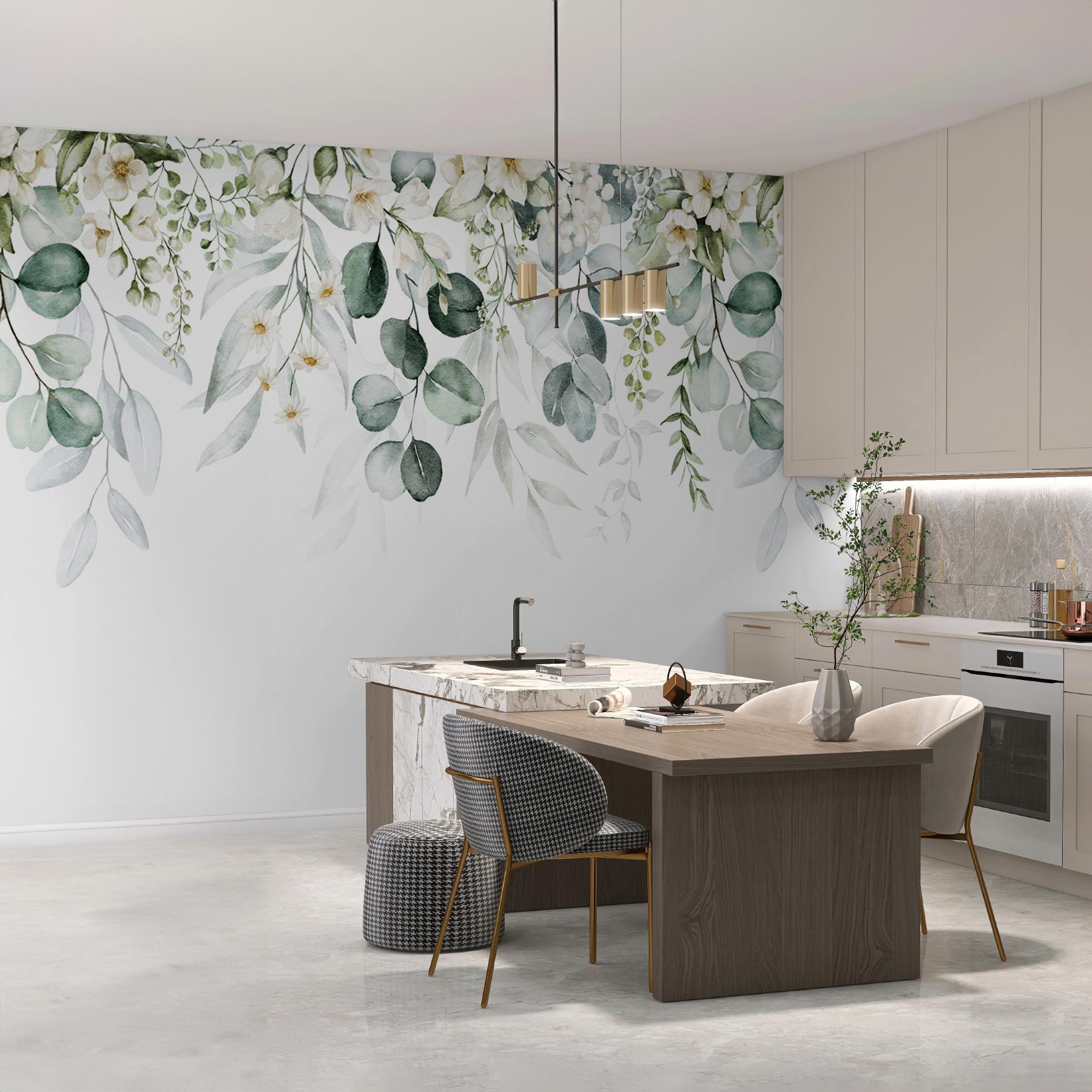 Imaginați-vă că pășiți într-o cameră împodobită cu eleganța încântătoare a florilor delicate și a frunzelor verzi și moi. Această pictură murală transformă fără efort orice spațiu într-o evadare senină. Imaginați-vă după-amieze leneșe petrecute cu o carte, în timp ce culorile blânde vă cuprind într-o îmbrățișare liniștitoare. Perfectă pentru un colț confortabil sau o zonă de luat masa aerisită, aceasta invită vibrații odihnitoare și un strop de natură în interior. Prietenii vor intra și, pur și simplu, conversația se va îndrepta spre escapade botanice fericite. Nu este doar tapet; este o stare de spirit. Cine ar fi crezut că un perete poate aduce atâta căldură și farmec?