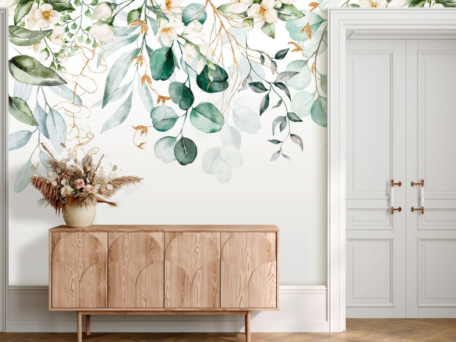 Fototapet Botanică acuarelă verdeață cu flori Fototapet Botanică acuarelă verdeață cu flori