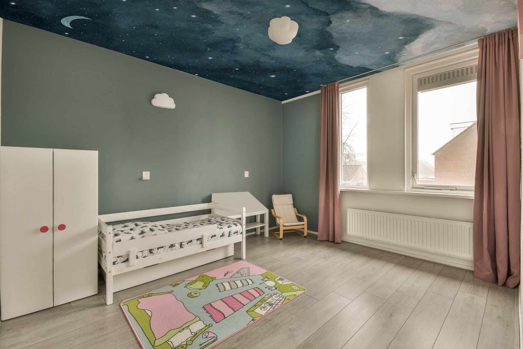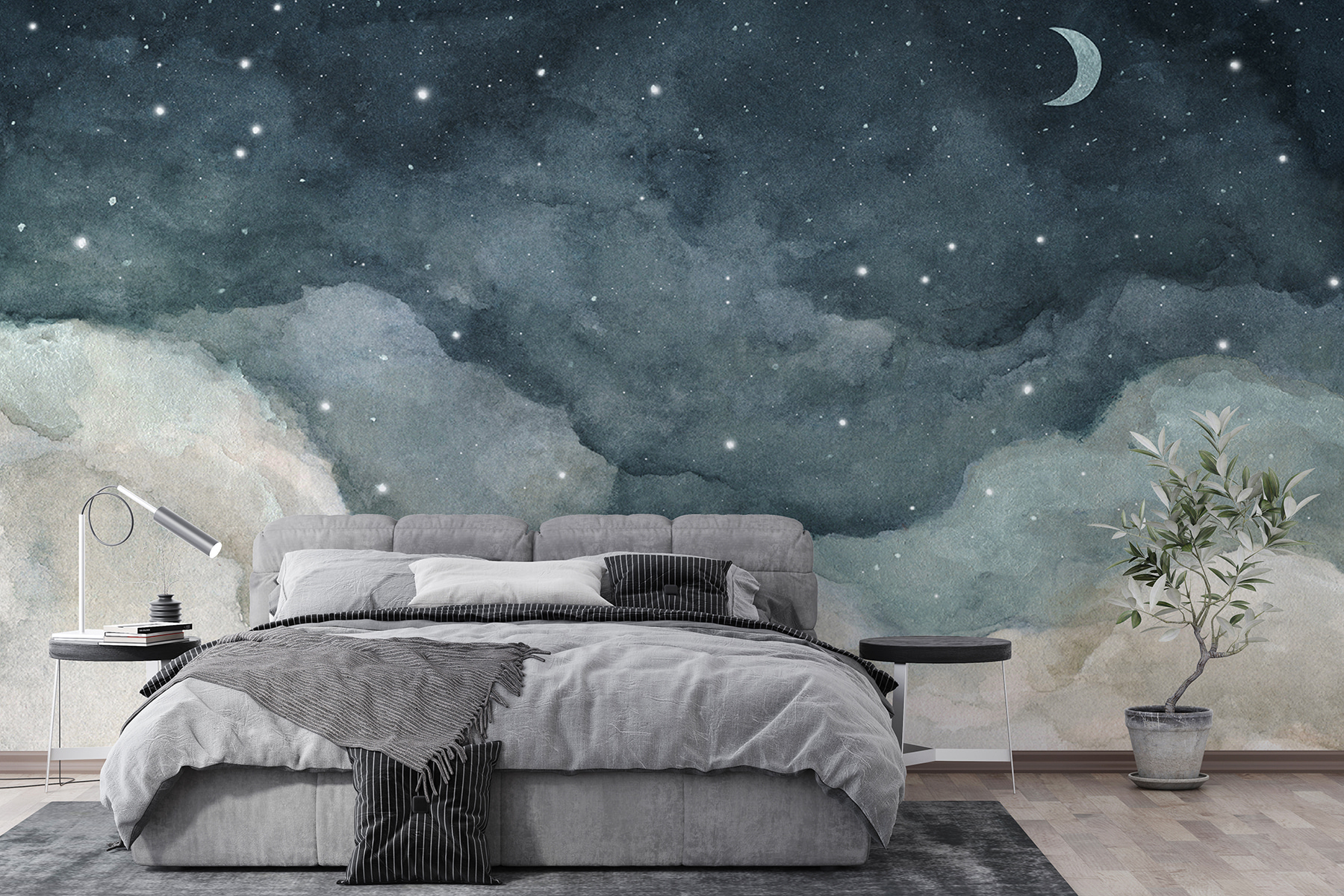 Are această vibrație blândă de acuarelă, făcând totul să pară calm și magic. Acei nori senini și stelele împrăștiate? Absolut liniștitoare. Este ca și cum ai avea propria ta bucată de cer nocturn în casă. Copiilor (și, sincer, adulților) le va plăcea să adoarmă sub această scenă celestă. Vorbim despre un fundal de poveste înainte de culcare!