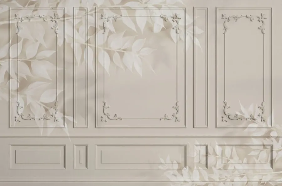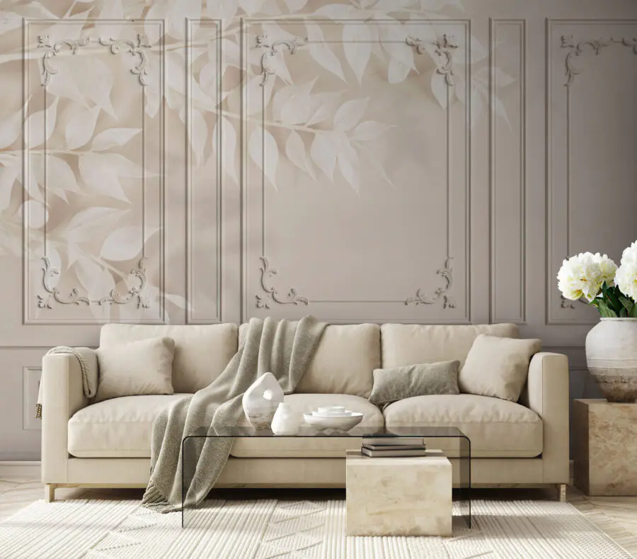 Transformarea unei încăperi poate fi la fel de simplă ca o pictură murală, iar aceasta are un farmec unic care se potrivește perfect. Ușa albă cu o margine neagră creează un punct focal izbitor, perfect pentru cei care doresc să adauge o notă de eleganță fără a exagera. Imaginați-vă: camera dvs. de zi pare brusc mai proaspătă, întâmpinând vizitatorii cu o notă de rafinament. Modelele delicate de frunze șoptesc naturii, invitând la o atmosferă calmă, perfectă pentru relaxare după o zi lungă. Este ca și cum ai aduce o grădină liniștită în interior. Este o piesă de artă care nu strigă, ci mai degrabă vă îndrumă ușor decorul către ceva special. Imaginați-vă sorbind o ceașcă de cafea, simțindu-vă inspirat de acele curbe blânde și tonuri moi! Nu este doar un tapet; este un starter de conversație.