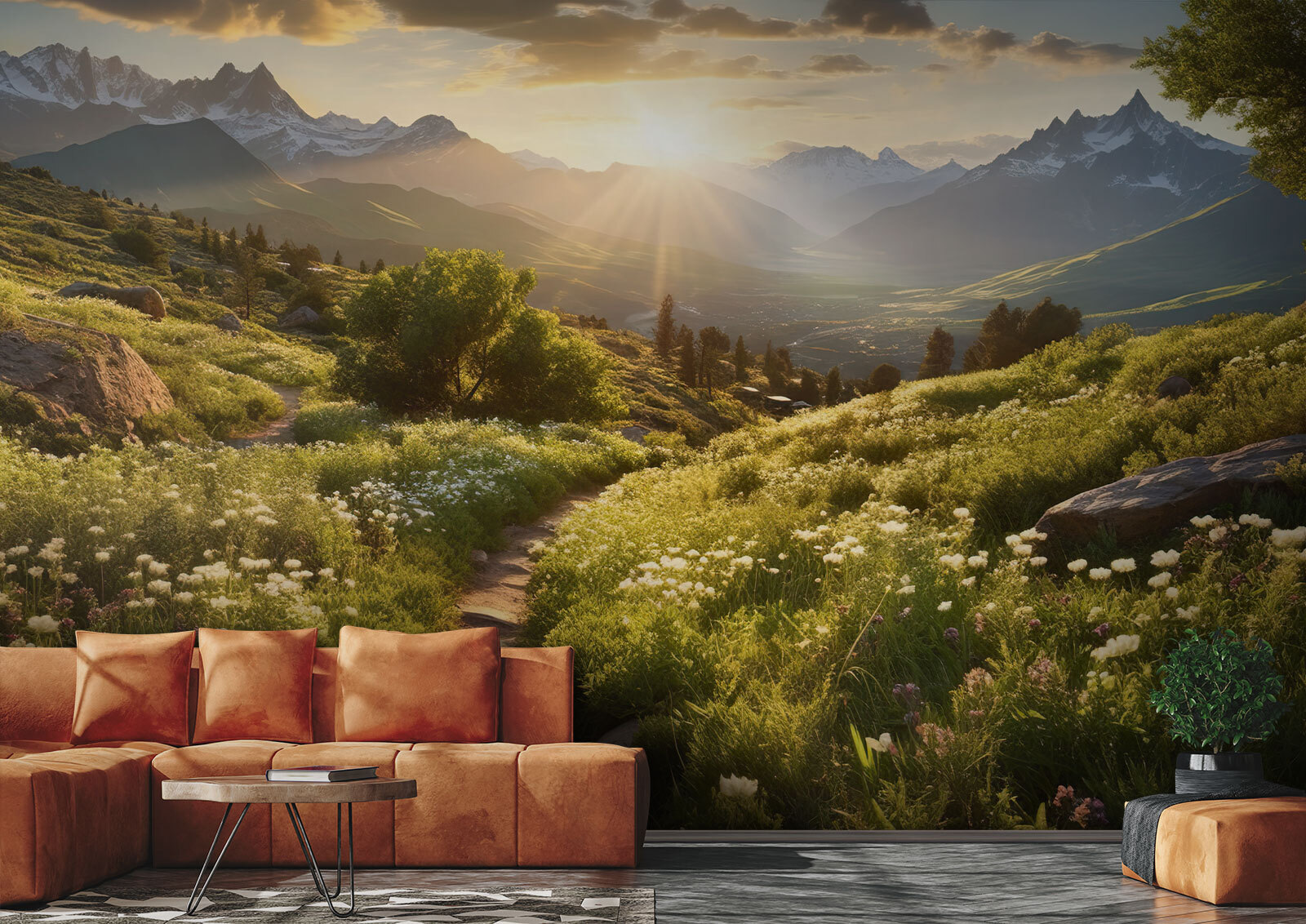 În regulă, imaginează-ți asta: ești în sufrageria ta, dar dintr-o dată nu mai ești. Această pictură murală? Face asta. Este ca și cum ai intra într-un paradis liniștit, înconjurat de un copac luxuriant și de munți maiestuoși în depărtare. Aproape că veți simți aerul proaspăt de munte și veți auzi foșnetul frunzelor.