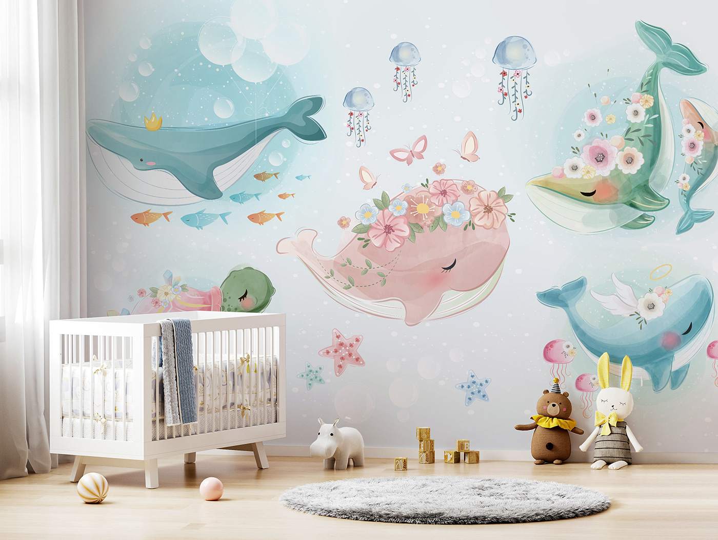 Imaginați-vă că adăugați o notă de fantezie camerei micuțului dvs. cu pictura murală “Balenă roz cu flori pe cap”. Vă puteți imagina? Această pictură murală încântătoare prezintă o balenă adorabilă, în nuanțe roz, încoronată cu flori delicate, plutind printre o mare de prieteni marini fermecători – meduze, țestoase și multe altele! Este perfectă pentru a stârni vise dulci și aventuri oceanice.