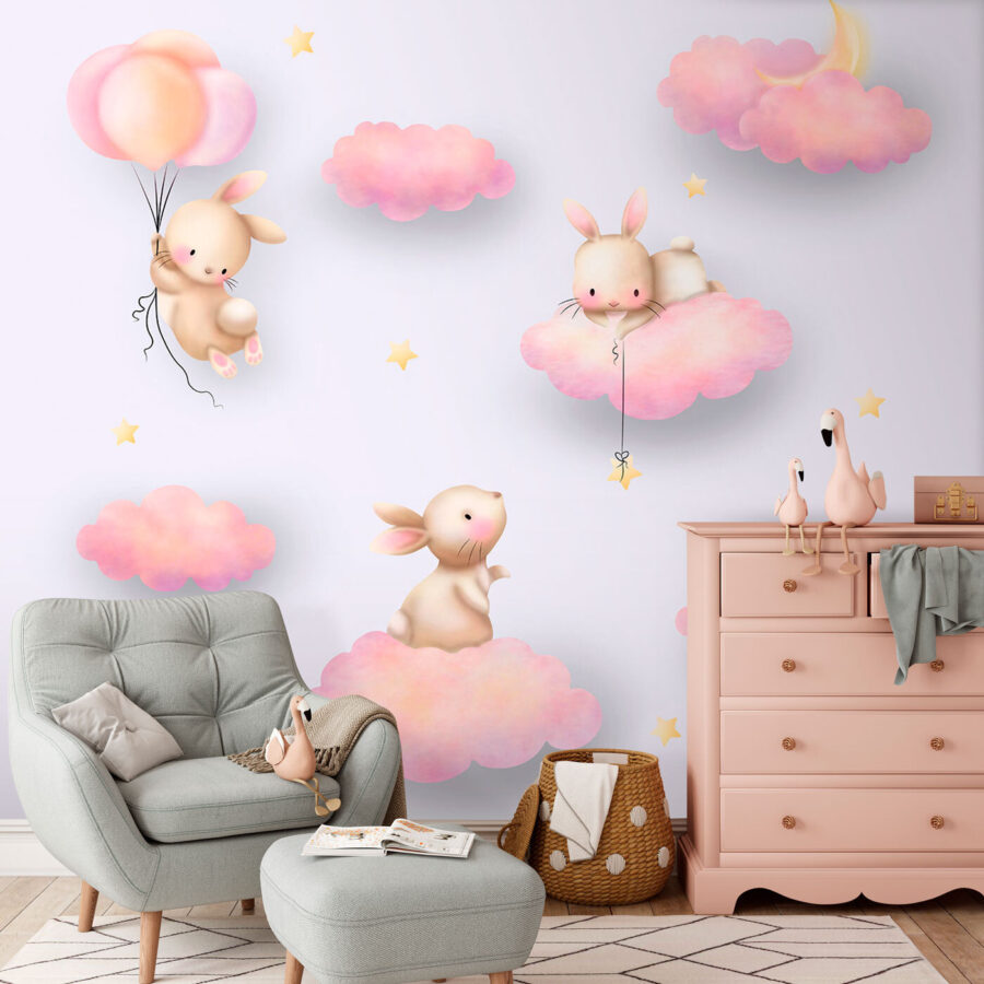 Imaginați-vă camera copilului dvs. transformată într-un peisaj de vis capricios cu această pictură murală adorabilă cu iepurași din desene animate! Acești iepurași dulci plutesc pe nori, țin în mână sfori și ajung la stele – este ca o scenă dintr-o poveste de adormit copiii! Perfect pentru camerele copiilor – fie că este pentru fiul sau fiica dvs., sau doar pentru a adăuga un strop de magie oricărui spațiu pentru copii.