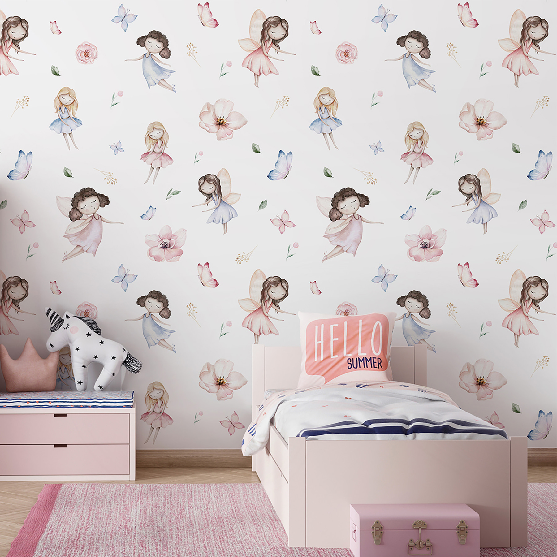 Imaginați-vă că intrați într-o cameră și sunteți întâmpinați de această pictură murală încântătoare. Este ca și cum ați păși într-un basm capricios, nu-i așa? Această pictură murală “Desenul unei fete în rochie” debordează de farmec și inocență. Perfectă pentru spațiul micuțului dvs., aceasta prezintă ilustrații dulci ale unor fete în rochii minunate, înconjurate de fluturi fluturând și flori delicate.