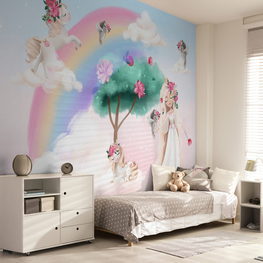 Imaginați-vă acest lucru – pășind într-o cameră în care unicornii se plimbă pe nori pufoși și curcubeele se arcuiesc grațios peste o scenă capricioasă. Această pictură murală “Unicorni și curcubee în scenă magică” transformă camera oricărui copil într-un paradis de vis. Perfectă pentru grădinițe, camere de joacă sau orice spațiu al iubitorilor de unicorni, aceasta combină culori vibrante și elemente fantastice pentru a stârni imaginația. Imaginați-vă-l pe micuțul dvs. privind la unicornii fermecători și poate chiar visând la propriile aventuri. Nu este doar o pictură murală – este o experiență magică în fiecare zi! În plus, este un mod distractiv de a inspira povestirea sau de a face ora de culcare un pic mai fermecată.