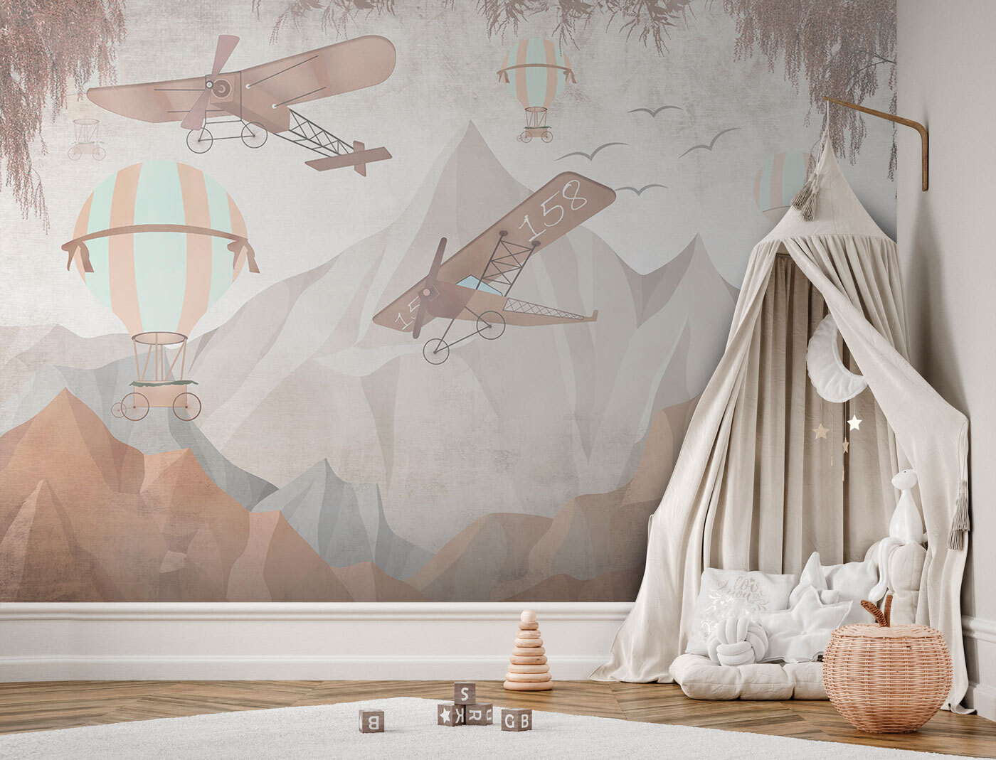 Imaginați-vă-l pe micuțul dvs. privind în sus, poate imaginându-și că se plimbă într-unul dintre aceste baloane fermecătoare. Nu este doar o pictură murală, este o trambulină pentru aventuri și povești de vis. Indiferent dacă copilul tău visează să piloteze un avion de epocă sau să plutească deasupra norilor, această pictură murală stârnește cu ușurință creativitate și bucurie. Te simți inspirat? Da, este atât de puternic. În plus, cui nu i-ar plăcea un fundal care este, practic, o evadare instantanee spre un vârf de munte senin? Absolut încântător.