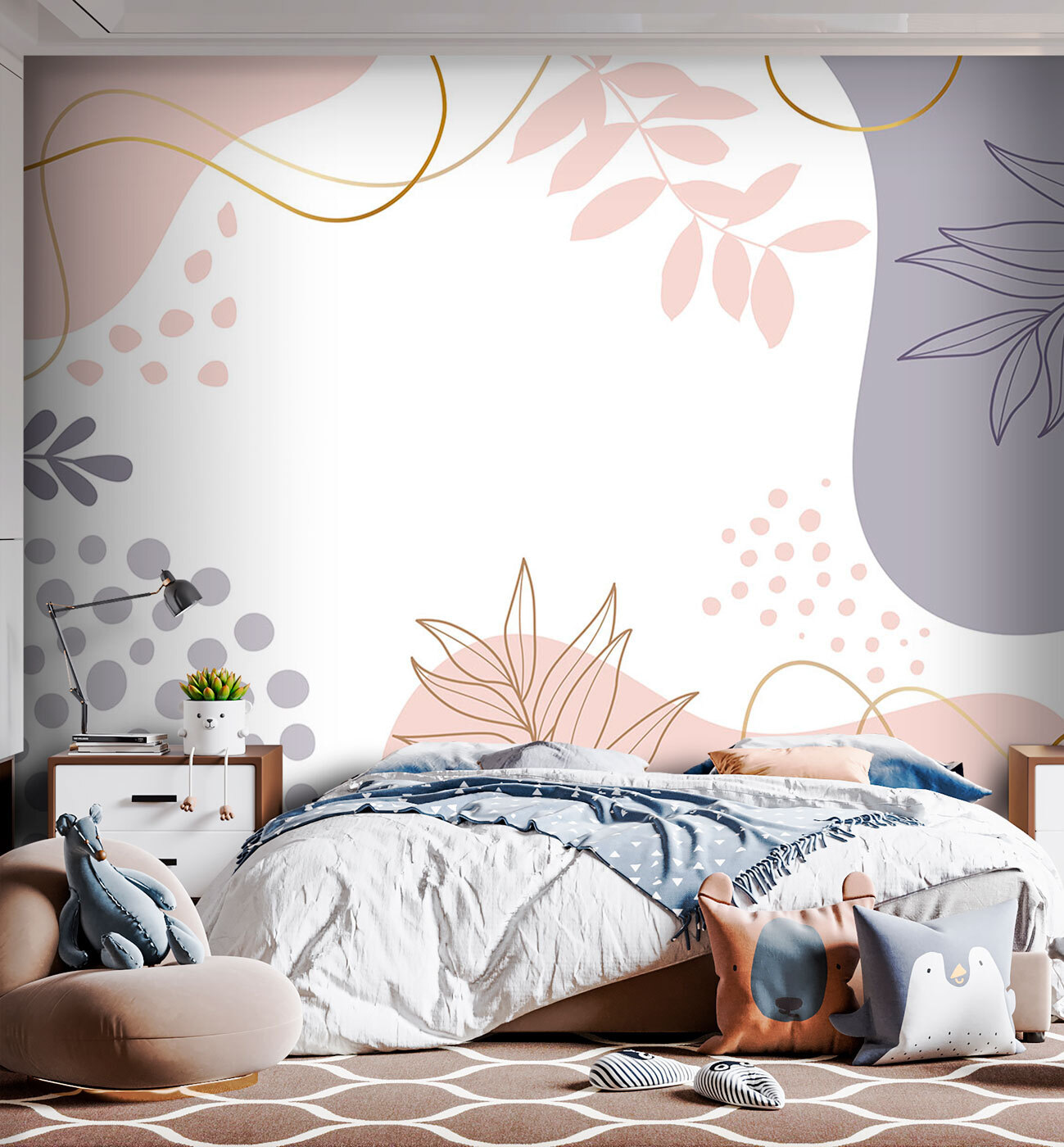 Transformați orice cameră într-o oază confortabilă cu această pictură murală fermecătoare cu frunze abstracte și forme pastelate moi. Este ca și cum ai aduce o felie de natură în interior, fără murdărie și insecte! Imaginați-vă o cameră de joacă pentru copii sau un colțișor confortabil în care cei mici pot visa mult și se pot juca din greu. Culorile blânde creează o atmosferă liniștitoare, stârnind creativitatea fără a copleși simțurile. Fiecare frunză pare să șoptească secretele pădurii, iar aceste forme? Adaugă atingerea potrivită de fantezie. Perfect pentru a crea un spațiu personal în care amintirile înfloresc și imaginația poate să zburde!