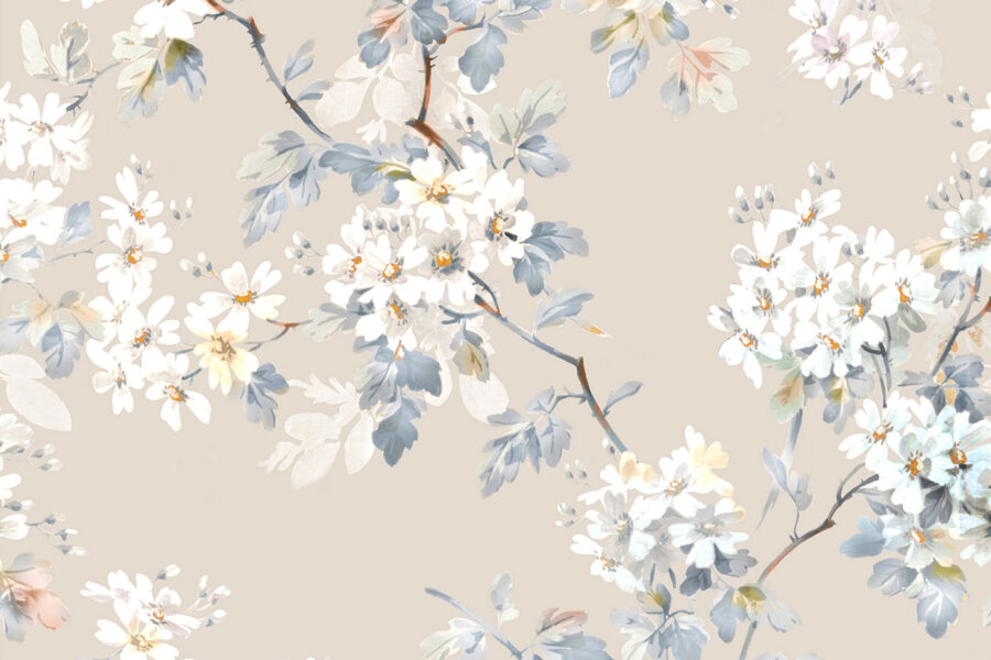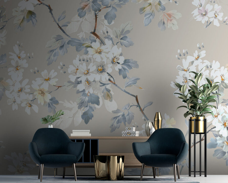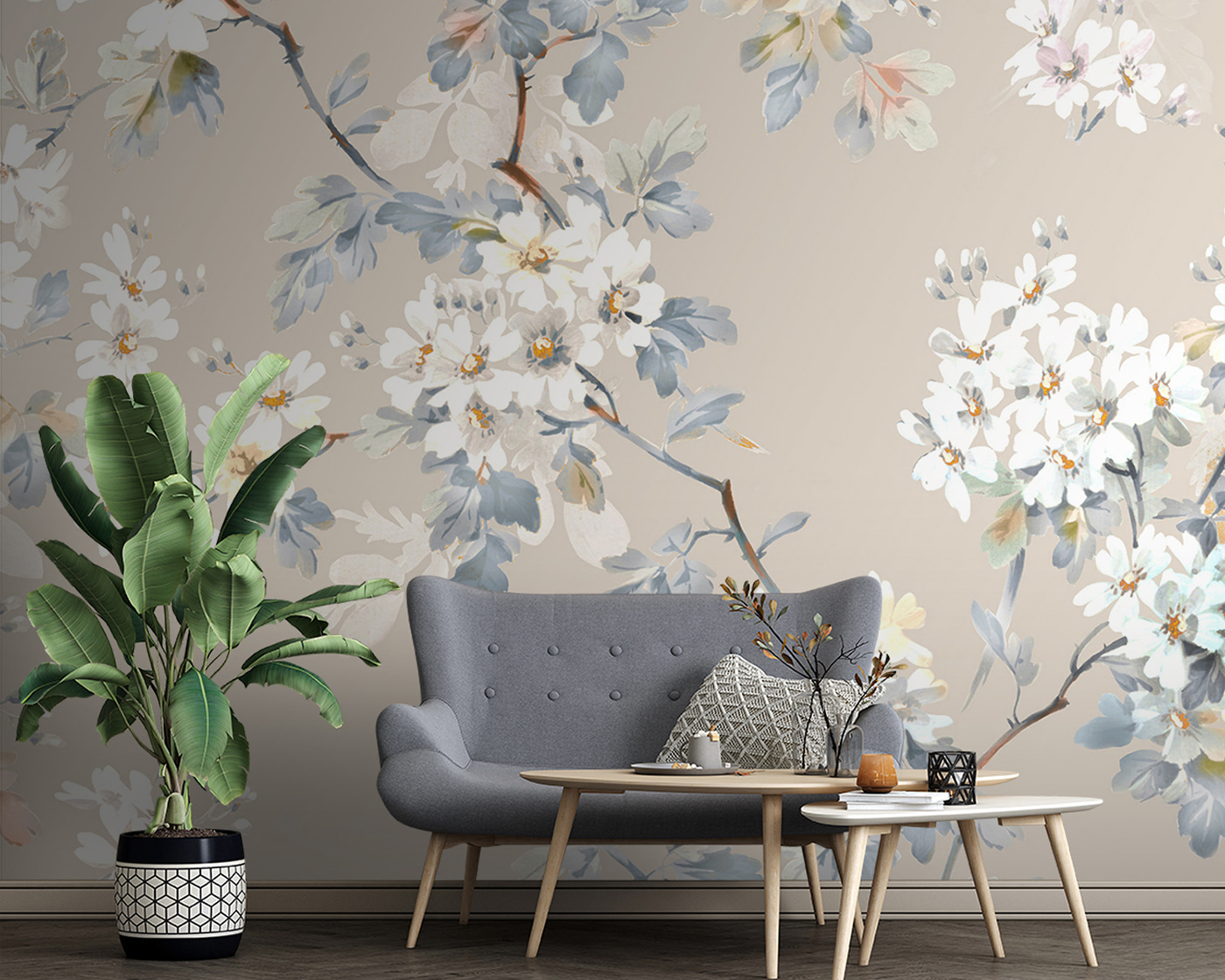 Aveți un perete gol care își dorește personalitate? Salutați această pictură murală florală delicată! Este vorba despre aducerea calmului și frumuseții naturii în interior. Imaginați-vă flori și frunze moi, pastelate, dansând grațios pe un fundal bej blând. Este ca o plimbare liniștită printr-o grădină înflorită – fără să vă murdăriți pantofii!