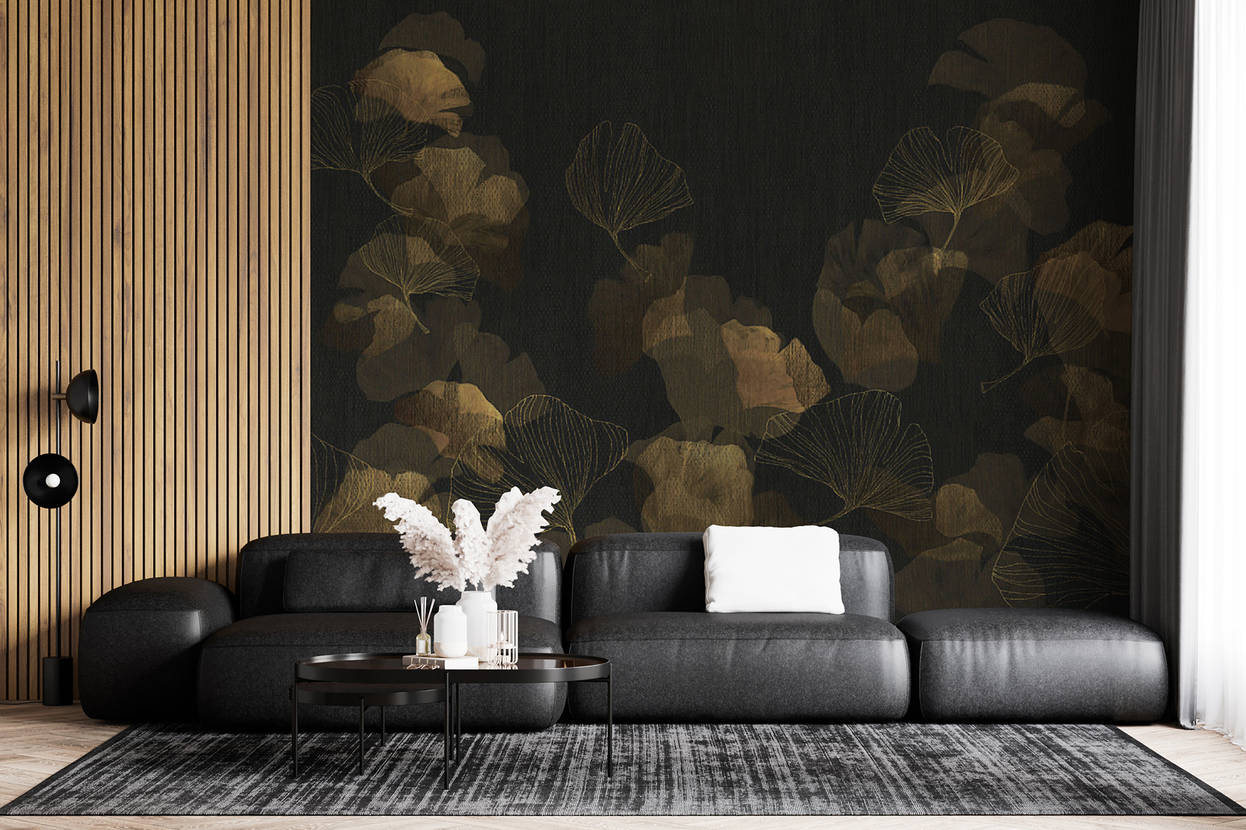 Transformați-vă spațiul cu această pictură murală uimitoare cu frunze delicate pe un fundal închis. Imaginați-vă intrând într-o cameră în care natura întâlnește eleganța, învăluindu-vă într-o îmbrățișare confortabilă. Aceasta adaugă o notă chic fără efort, făcând pereții să prindă viață fără a copleși simțurile.