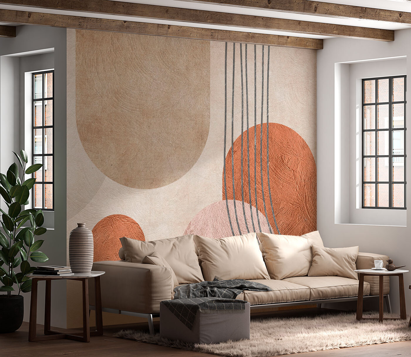 Transformați-vă spațiul cu această uimitoare pictură murală geometrică abstractă, în care tonurile pământii dansează împreună ca vechii prieteni la o reuniune. Imaginați-vă că pășiți într-o cameră care șoptește căldură și creativitate, invitându-vă să vă opriți și să reflectați. Curbele și liniile blânde creează un ritm liniștitor – perfect pentru nopți confortabile sau dimineți inspirate. Această pictură murală adaugă o notă de eleganță artistică, armonizându-se cu mobilierul și decorul, stârnind în același timp cantitatea potrivită de curiozitate. Nu este doar un perete; este o experiență. Cine nu ar vrea să petreacă timp cu asta?