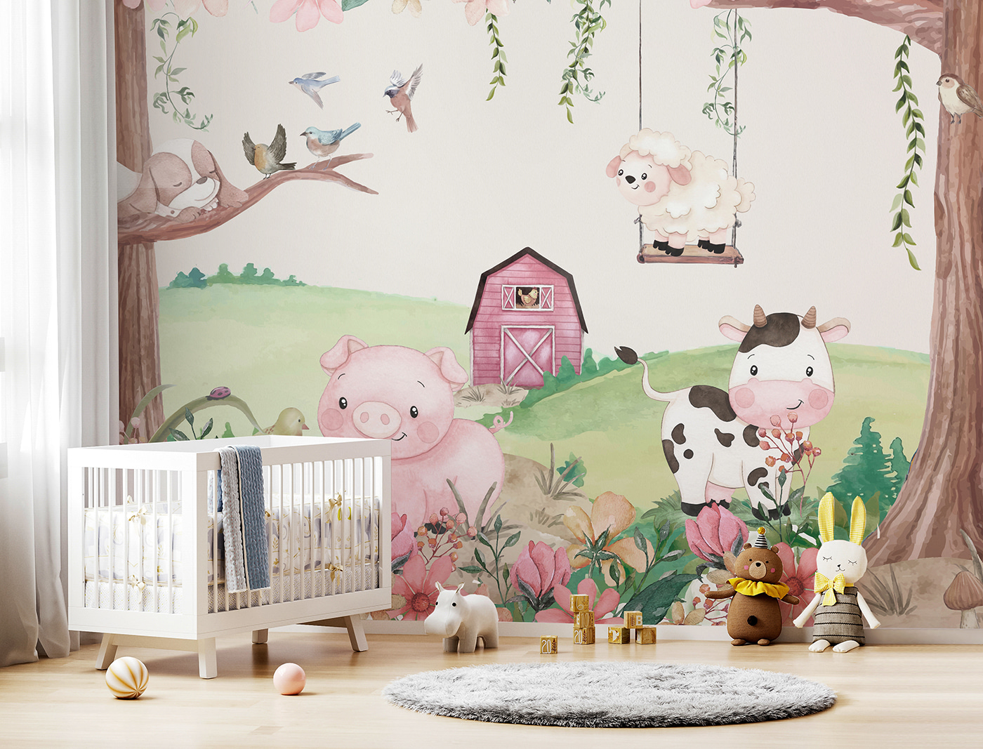 Bună ziua! Aruncați o privire la această pictură murală adorabilă – se numește “Picturi murale pentru grajduri roz cu o găină în fereastră”. Sincer, este pur și simplu prea drăguț pentru cuvinte! Perfect pentru a adăuga un strop de farmec oricărei grădinițe, cameră de joacă sau spațiu pentru copii. Imaginați-vă că vă treziți în fiecare zi la această scenă drăguță: un hambar roz aprins cu o găină curioasă care trage cu ochiul pe fereastră, înconjurat de animale vesele și flori colorate. Este ca o carte de povești care prinde viață!