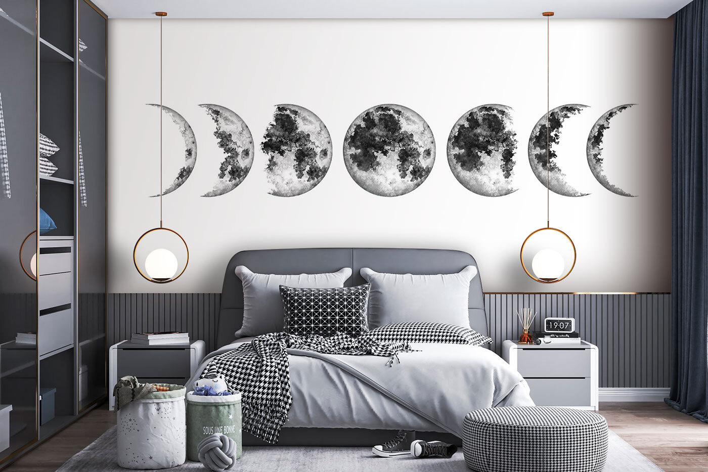 Transformați o cameră cu pictura murală captivantă “Row of Phases of the Moon”. Este ca și cum ai avea un cer de noapte chiar în casa ta, aducând un vibe calm care este perfect pentru copii și toți cei tineri la inimă. Imaginați-vă aceste luni în semilună care veghează noaptea asupra visătorilor, stârnind curiozitatea față de cosmos – cui nu-i place un pic de magie înstelată? Este o sursă excelentă de conversație și perfectă pentru camerele de joacă sau dormitoare. În plus, dă pereților o întorsătură de vis, perfectă pentru a inspira aventura celor mici. Aprindeți imaginația și lăsați luna să le fie ghid!