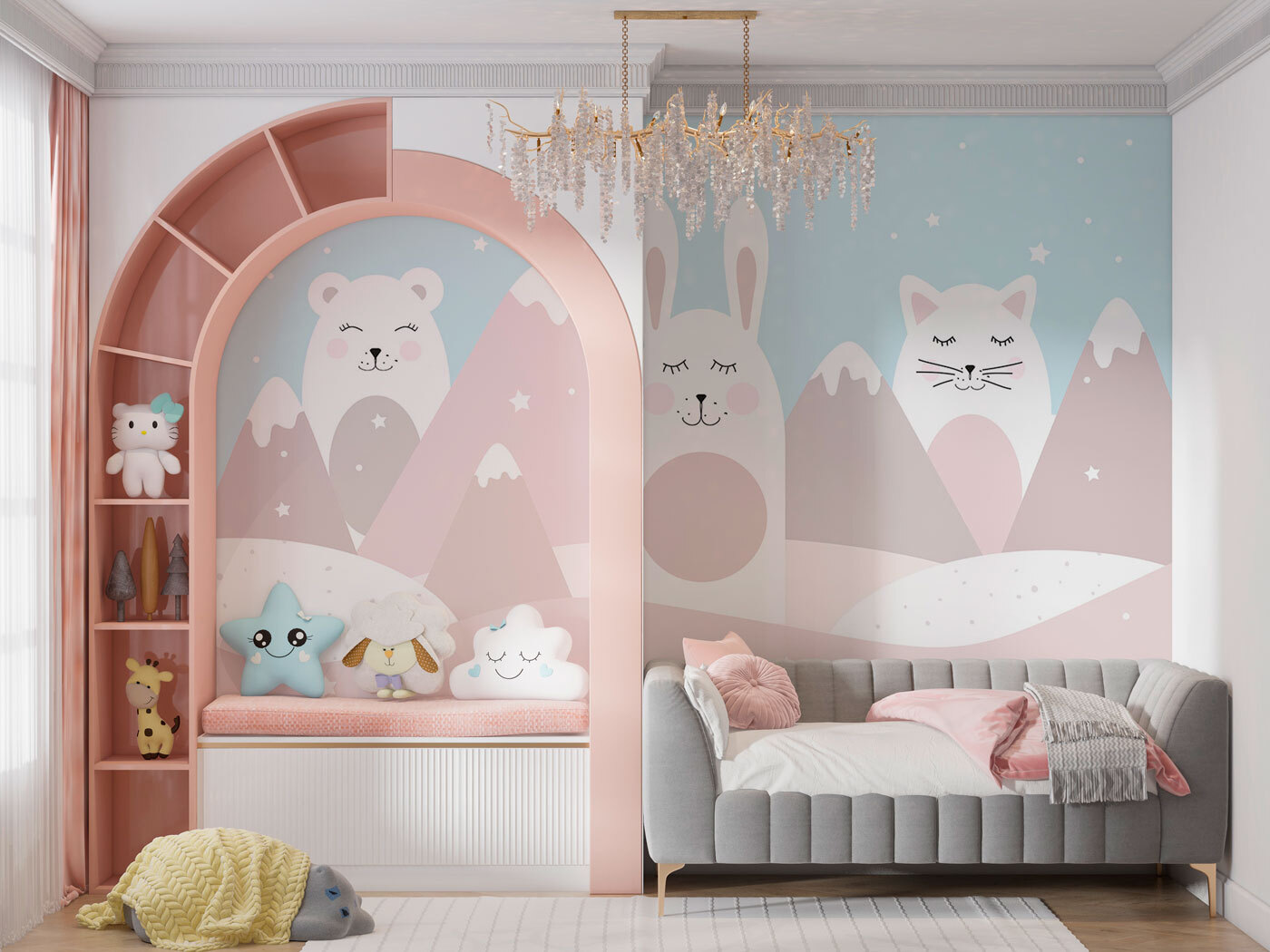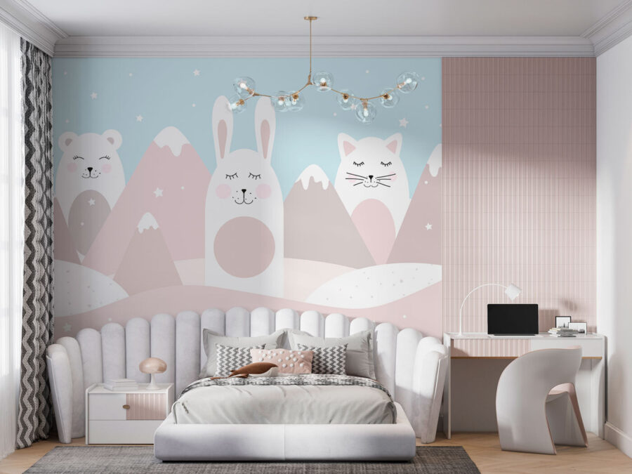 Imaginați-vă că intrați în camera copilului dvs. și sunteți întâmpinați de cel mai drăguț trio de animale în cele mai pastelate și liniștitoare culori. Această pictură murală capricioasă prezintă o pisică albă cu obraji roz, cuibărită între un iepuraș prietenos și un urs, toate într-un peisaj de vis cu munți moi și stele sclipitoare. Este ca o poveste de adormit copiii care prinde viață! Perfectă pentru orice mic explorator sau iubitor de animale, această pictură murală aduce o atingere de magie și un strop de bucurie în spațiul lor. Culorile blânde și personajele adorabile vor inspira cu siguranță vise dulci și aventuri mari. Părinții o iubesc pentru că este ca o îmbrățișare liniștită și imaginativă pentru cameră – cine nu și-ar dori asta?