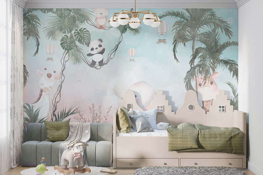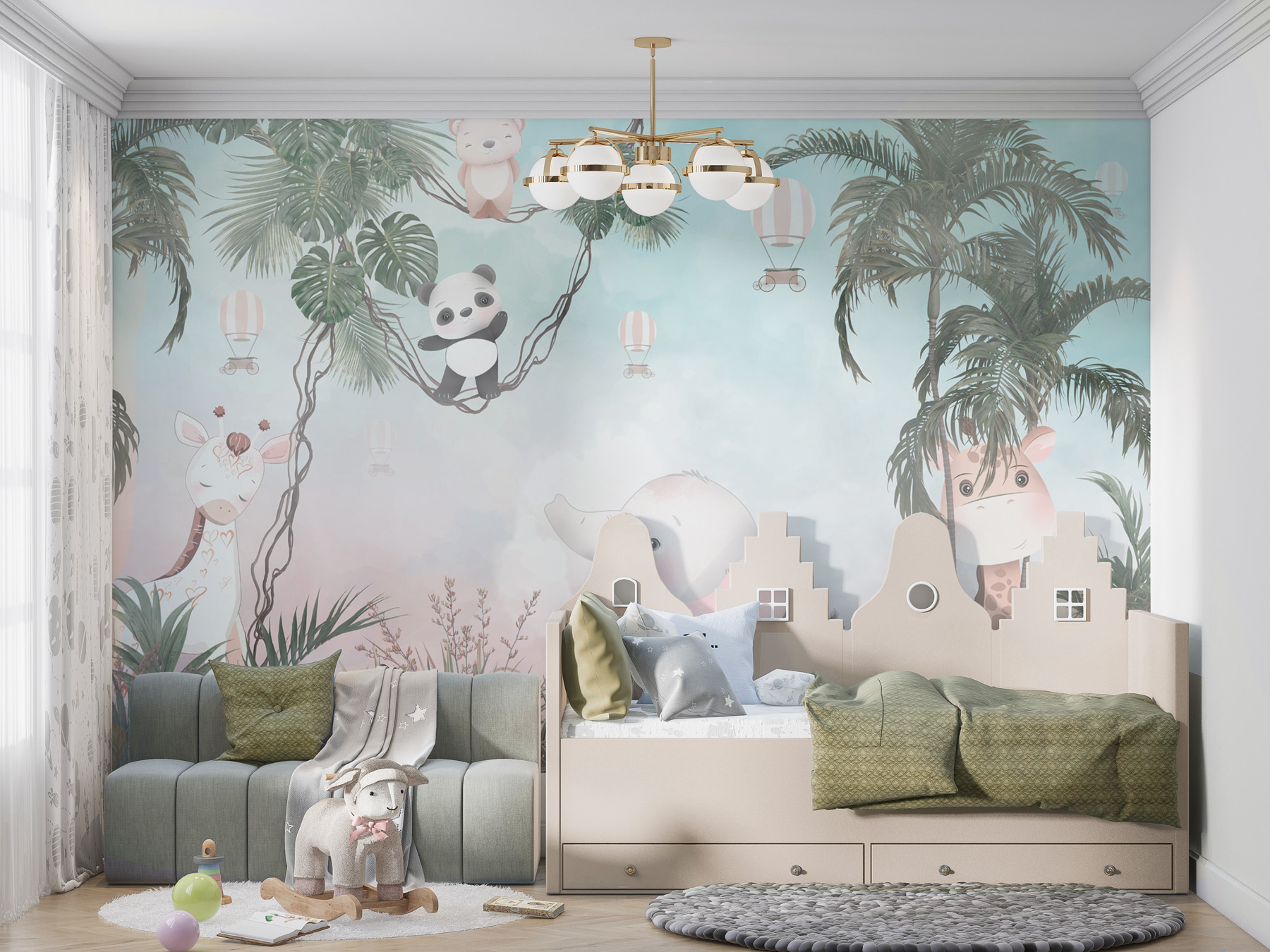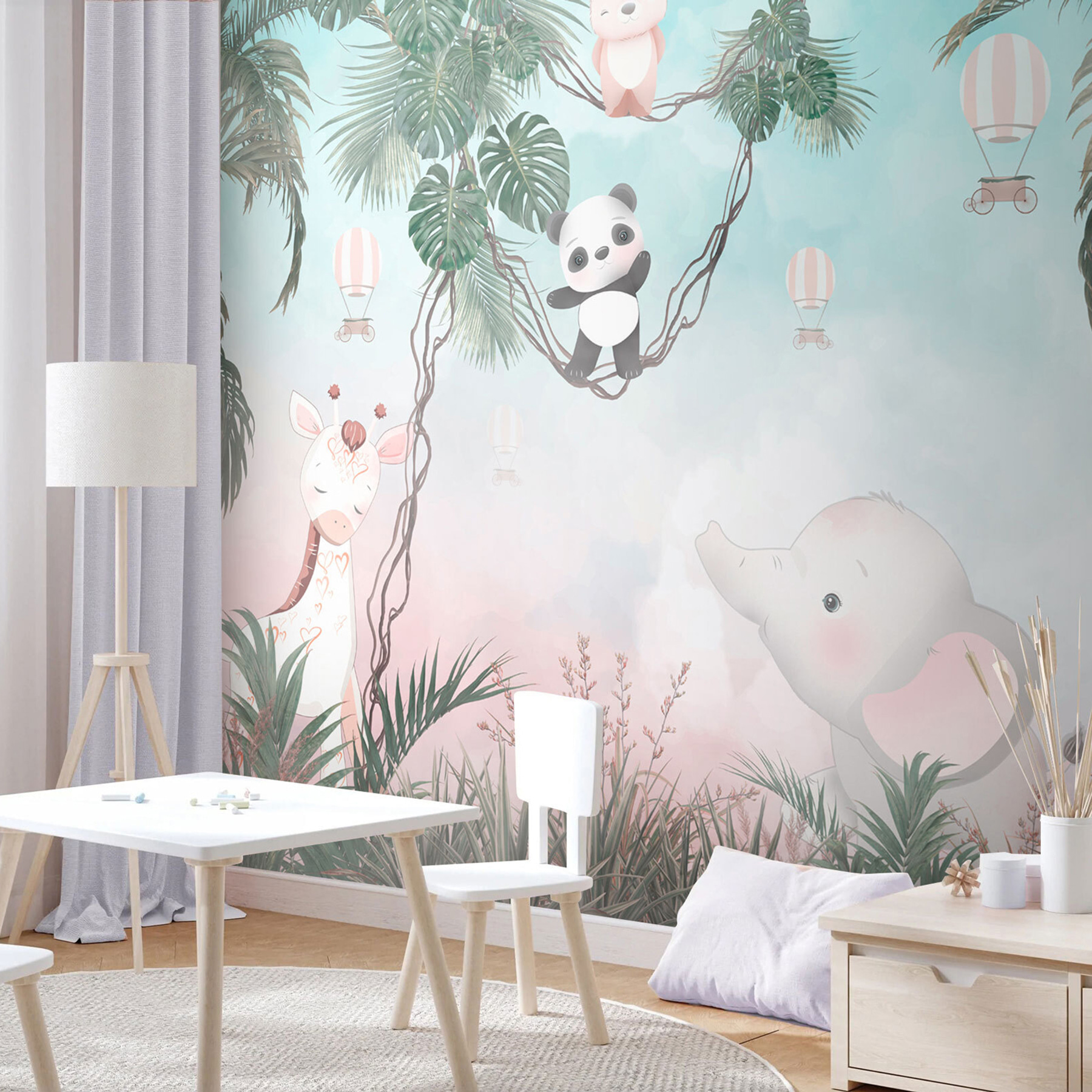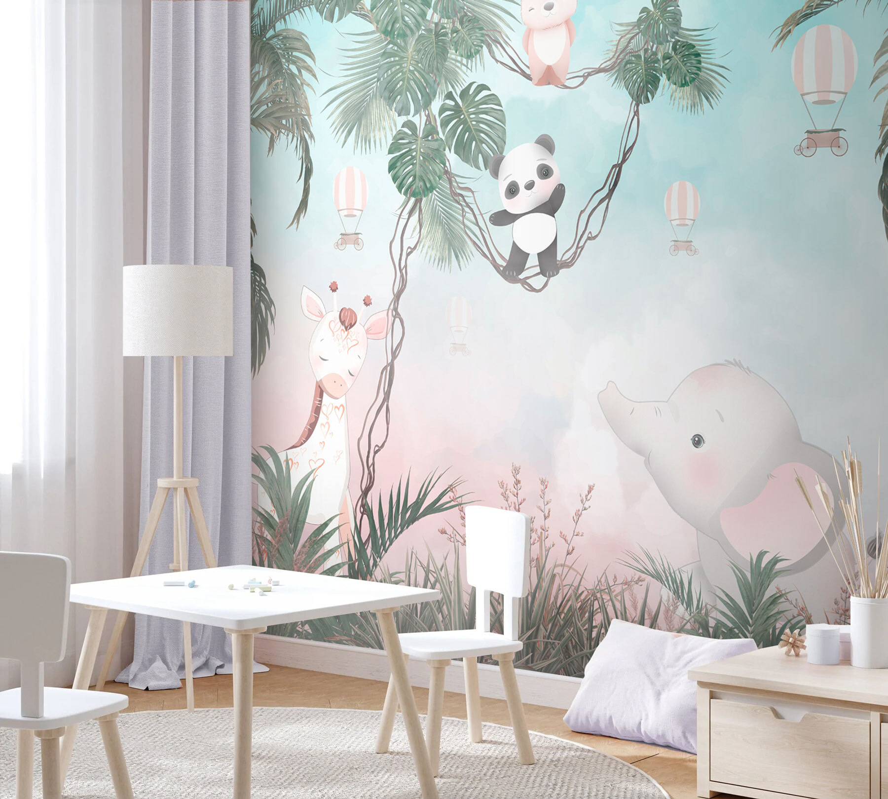 Transformați orice perete plictisitor într-o aventură cu acest mural de perete cu un panda jucăuș din desene animate care este pur și simplu adorabil. Imaginează-ți asta: o cameră de copil confortabilă în care micuțul tău își poate imagina cum se leagănă prin copaci alături de un panda prietenos și un elefant care pare gata să dea câteva chicoteli blânde. Culorile moi creează un fundal liniștitor, perfect pentru ora de somn sau de povești. Este ca o escapadă în junglă chiar la tine acasă. Imaginați-vă zâmbetele când oaspeții intră și văd această scenă veselă – practic invită bucuria și imaginația în cameră. Este o modalitate ușoară de a face un spațiu să se simtă ca un mini safari!