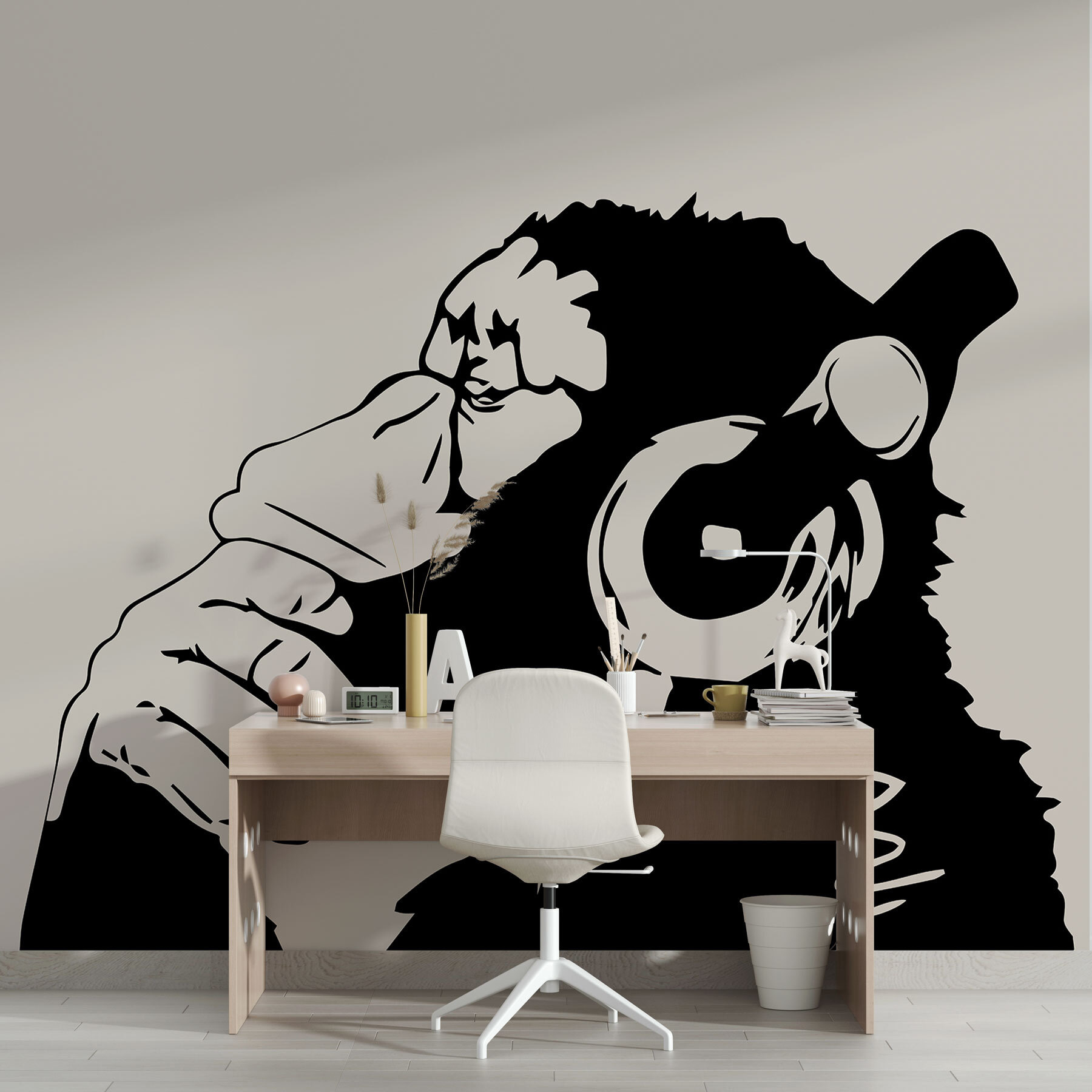 Aveți un perete plictisitor care are nevoie de puțină personalitate? Dați-i viață cu această pictură murală “Maimuță purtând căști”! Perfectă pentru a adăuga un strop de distracție în orice cameră, fie că este vorba de dormitorul unui copil, de o cameră de joacă sau chiar de biroul dvs. de acasă, dacă vă simțiți aventuros. Această maimuță obraznică înțelege – uneori trebuie să dai drumul la muzică și să te pierzi în propria ta lume. Este excentrică, contemporană și va face pe oricine să zâmbească. Știți sentimentul acela când muzica este perfectă și orice altceva dispare? Da, maimuța asta o înțelege. Pereții tăi îți vor mulțumi!