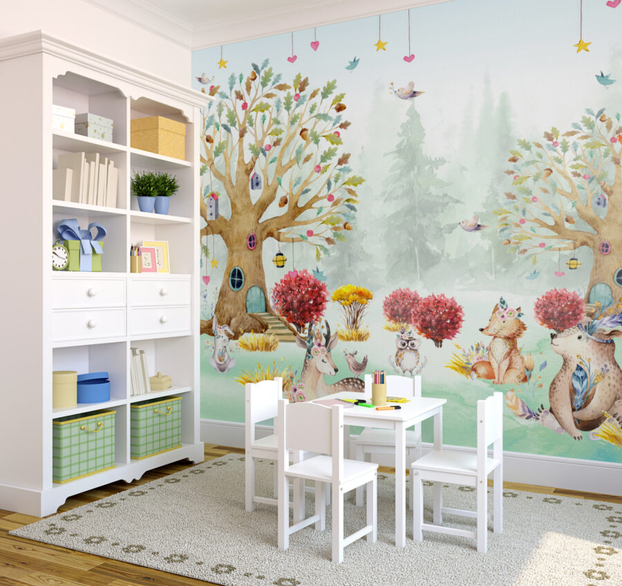 Transformați camera copilului dvs. într-un tărâm de basm de vis cu această pictură murală “Pictură în acuarelă cu animale într-o pădure”. Imaginați-vă că micuțului dvs. i se aprind ochii când vede căprioarele, vulpile și bufnițele capricioase printre copaci – fiecare cu propriile detalii drăguțe și excentrice. Este ca și cum ai păși într-o carte de povești! Perfectă pentru grădinițe și camere de copii, această pictură murală aduce un farmec liniștitor, pastelat, care va face poveștile de culcare și mai încântătoare. Fie că este vorba de o pădure magică pentru fiica dvs. sau de o pădure liniștită pentru băiețelul dvs., această pictură murală pregătește scena pentru ca imaginația și visele să se dezlănțuie. Nuanțele moi de acuarelă se simt blânde și confortabile, învăluind spațiul în căldură. Această pictură murală nu este doar decor – este o aventură care așteaptă să se desfășoare!