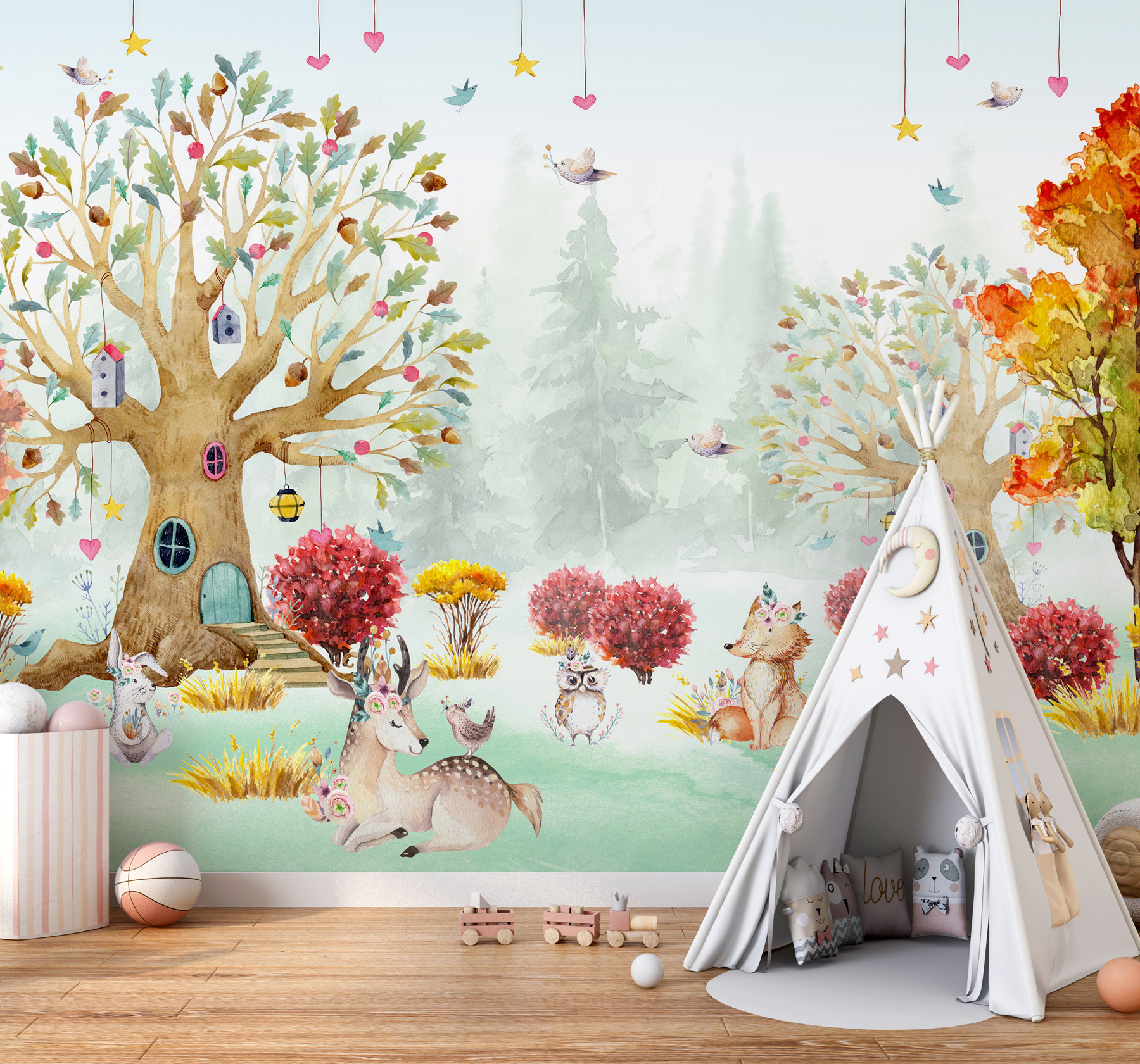 Transformați camera copilului dvs. într-un tărâm de basm de vis cu această pictură murală “Pictură în acuarelă cu animale într-o pădure”. Imaginați-vă că micuțului dvs. i se aprind ochii când vede căprioarele, vulpile și bufnițele capricioase printre copaci – fiecare cu propriile detalii drăguțe și excentrice. Este ca și cum ai păși într-o carte de povești! Perfectă pentru grădinițe și camere de copii, această pictură murală aduce un farmec liniștitor, pastelat, care va face poveștile de culcare și mai încântătoare. Fie că este vorba de o pădure magică pentru fiica dvs. sau de o pădure liniștită pentru băiețelul dvs., această pictură murală pregătește scena pentru ca imaginația și visele să se dezlănțuie. Nuanțele moi de acuarelă se simt blânde și confortabile, învăluind spațiul în căldură. Această pictură murală nu este doar decor – este o aventură care așteaptă să se desfășoare!