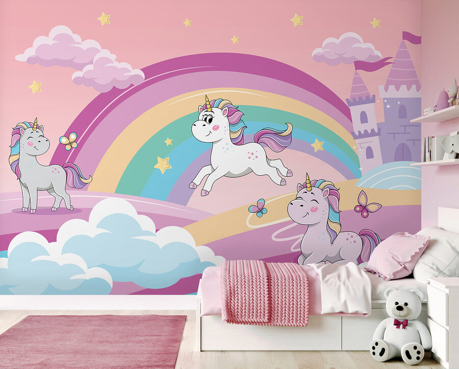 Transformați orice cameră obișnuită într-o evadare capricioasă cu această pictură murală adorabilă cu unicorni! Imaginați-vă fluturi dansând în jurul curcubeelor colorate, în timp ce unicornii jucăuși pășesc sub un cer roz. Este ca și cum ai păși într-o carte de povești, unde magia este doar la o bătaie de inimă distanță. Perfectă pentru a stârni imaginația celui mic, această pictură murală oferă o atmosferă confortabilă și distractivă, făcând fiecare zi să pară o aventură. Cu siguranță va aduce zâmbete și chicoteli, plus un strop de bucurie de fiecare dată când intră. Cine nu și-ar dori un pic de magie de basm pe pereții săi?