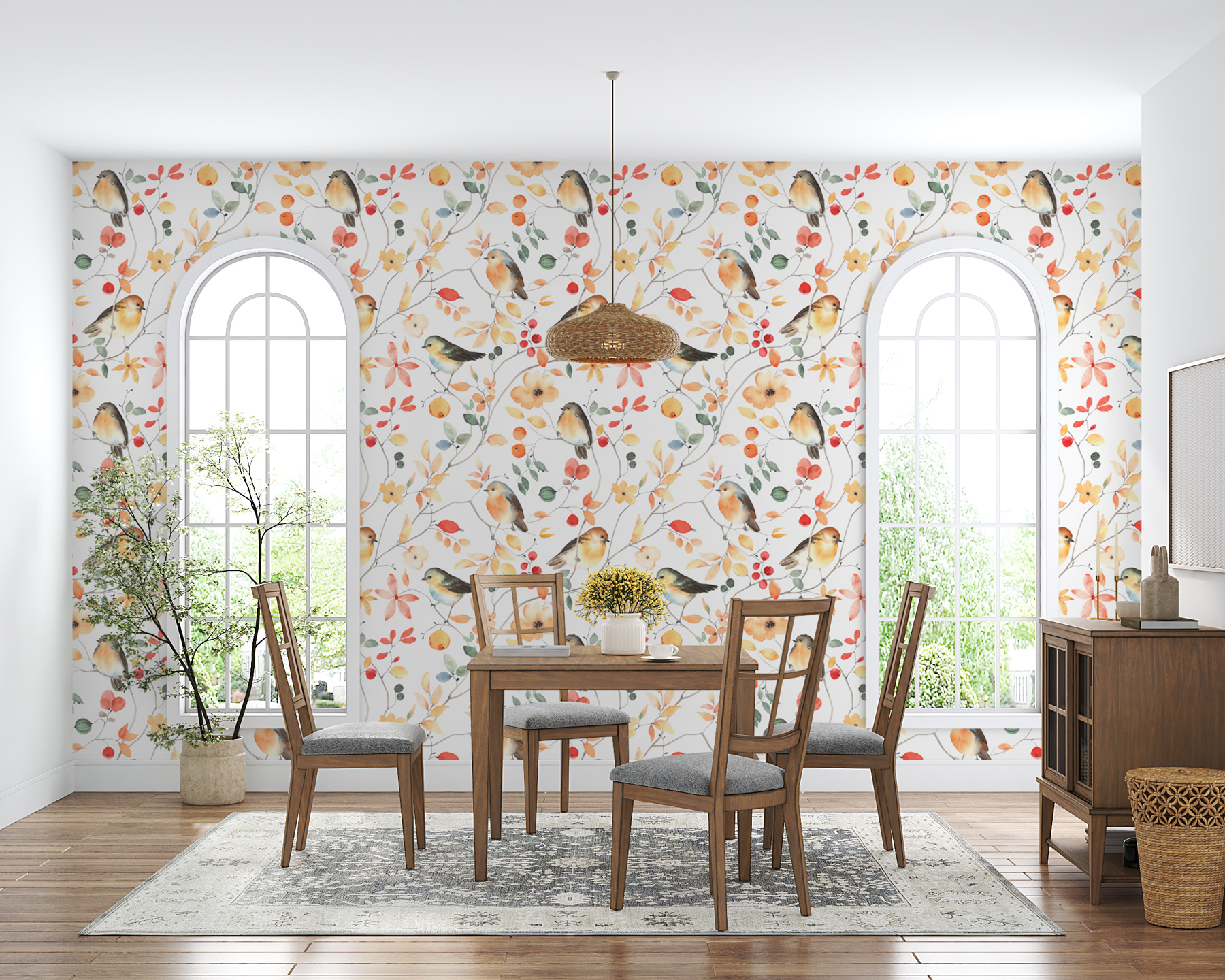 Imaginați-vă pereții prinzând viață cu această pictură murală “Bird on a Branch”! Nu este doar o imprimare; este ca și cum ai avea o felie personală de natură în spațiul tău. Imaginați-vă acest lucru: păsări delicate cocoțate pe ramuri, înconjurate de o simfonie de flori și frunze colorate. Perfectă pentru a adăuga o notă de fantezie și căldură în orice cameră, fie că este un dormitor, un colț de lectură confortabil sau chiar holul. Culorile moi și primitoare îl fac să se potrivească ușor cu diferite decoruri.