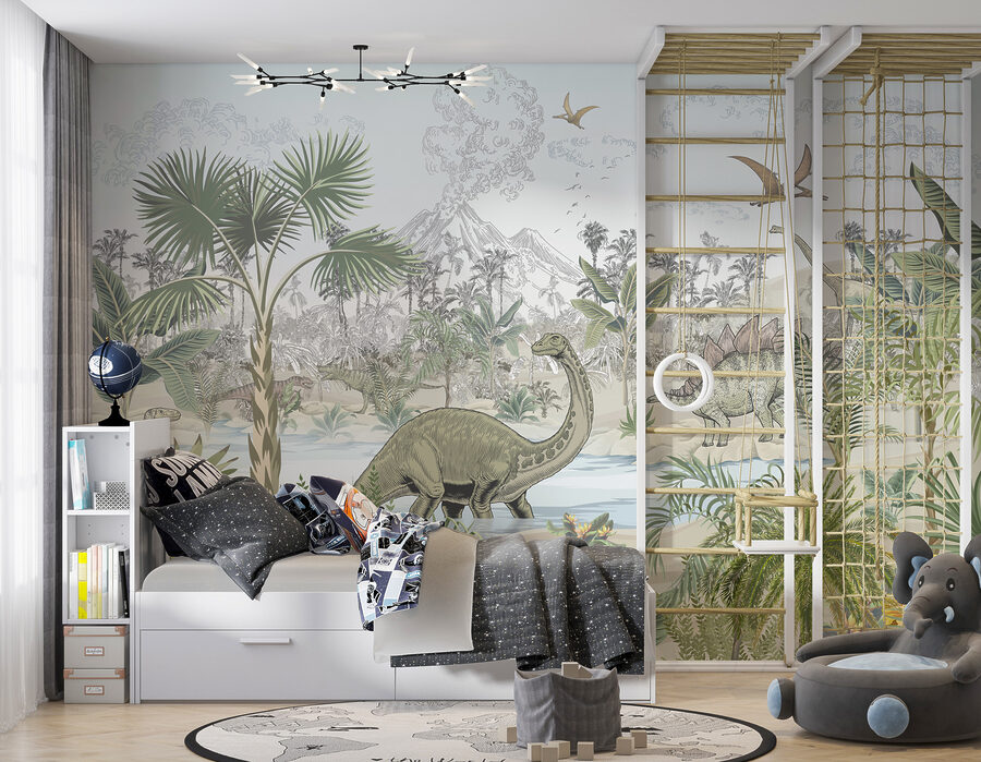 Transformați spațiul unui copil într-un paradis preistoric cu această pictură murală vibrantă cu dinozauri maiestuoși care se plimbă prin casa lor tropicală luxuriantă. Imaginați-vă entuziasmul cu care cei mici privesc acești giganți blânzi, explorând lumea lor fantastică. Cu palmieri care se leagănă și un vulcan care suflă în fundal, acest mural stârnește imaginația și aventurile care merg dincolo de poveștile de culcare.