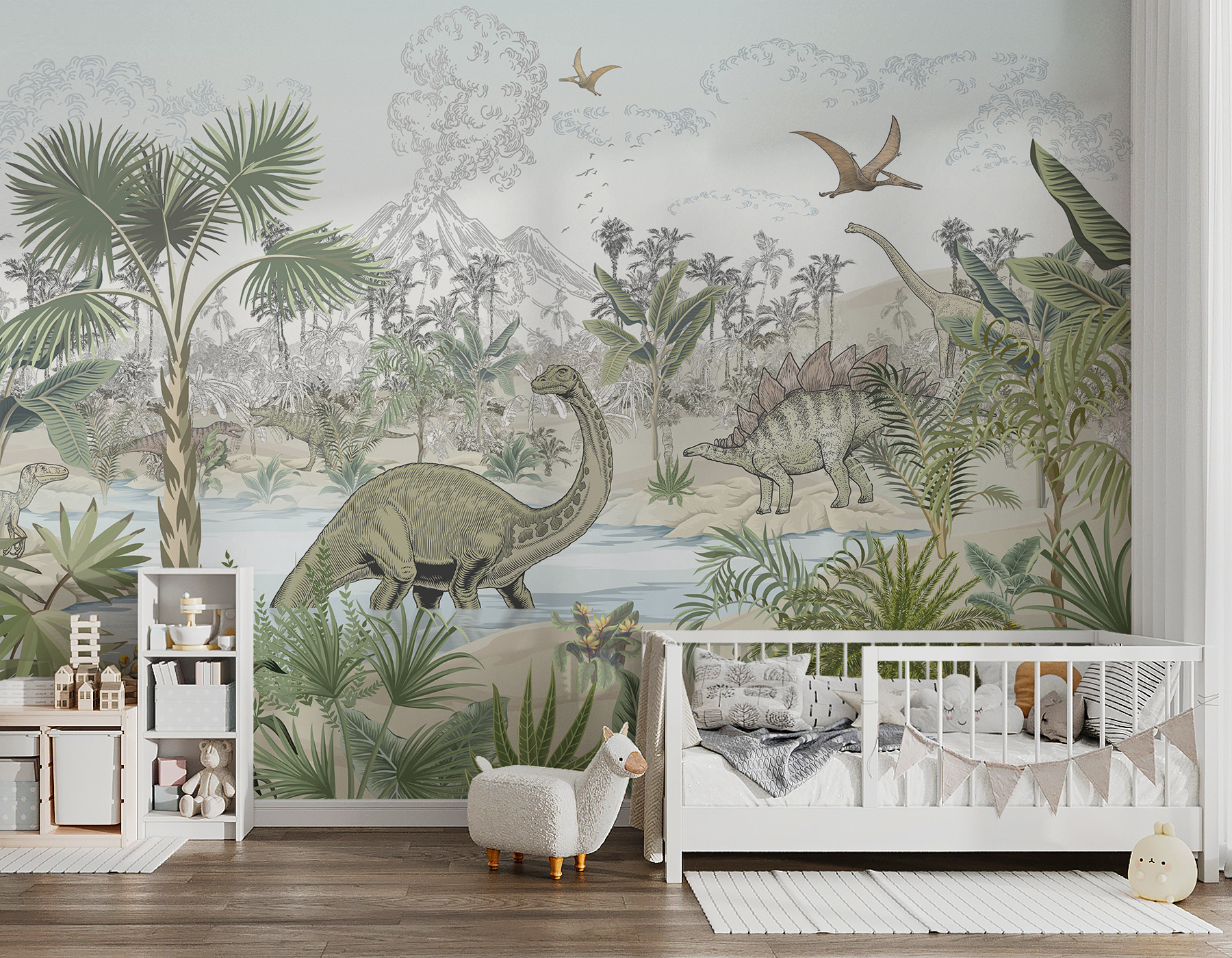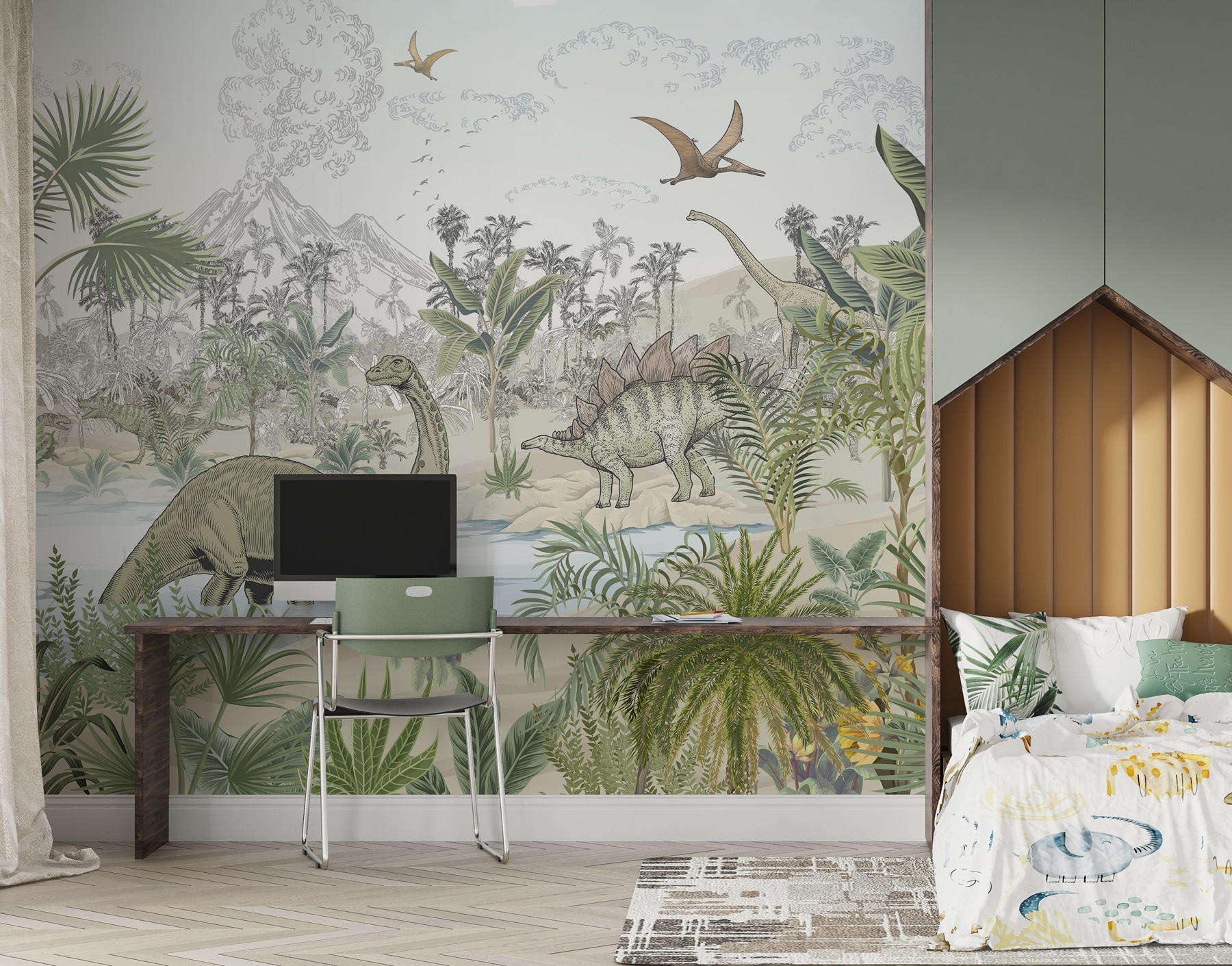 Transformați spațiul unui copil într-un paradis preistoric cu această pictură murală vibrantă cu dinozauri maiestuoși care se plimbă prin casa lor tropicală luxuriantă. Imaginați-vă entuziasmul cu care cei mici privesc acești giganți blânzi, explorând lumea lor fantastică. Cu palmieri care se leagănă și un vulcan care suflă în fundal, acest mural stârnește imaginația și aventurile care merg dincolo de poveștile de culcare.
