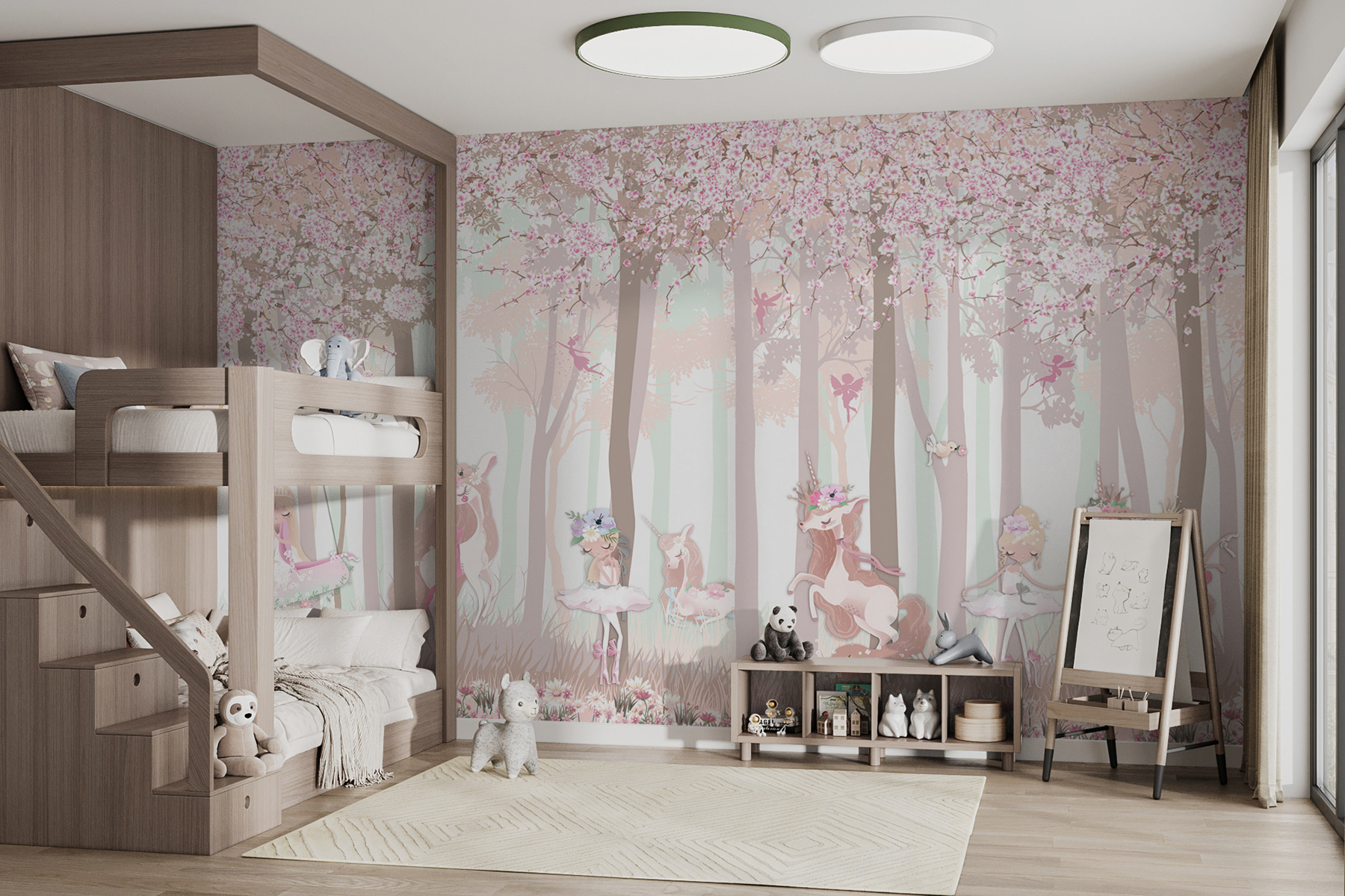 Florile delicate și zânele jucăușe aduc un sentiment de pace și bucurie, în timp ce aspectul de lemn moale adaugă căldură și confort. Micuțul tău va adora fantezia și încântarea de a avea propria pădure fermecată chiar pe pereți! Este ca o îmbrățișare dulce din partea camerei de fiecare dată când pășește înăuntru. Imaginați-vă povești de culcare înconjurate de acest fundal magic – fericire pură a copilăriei.