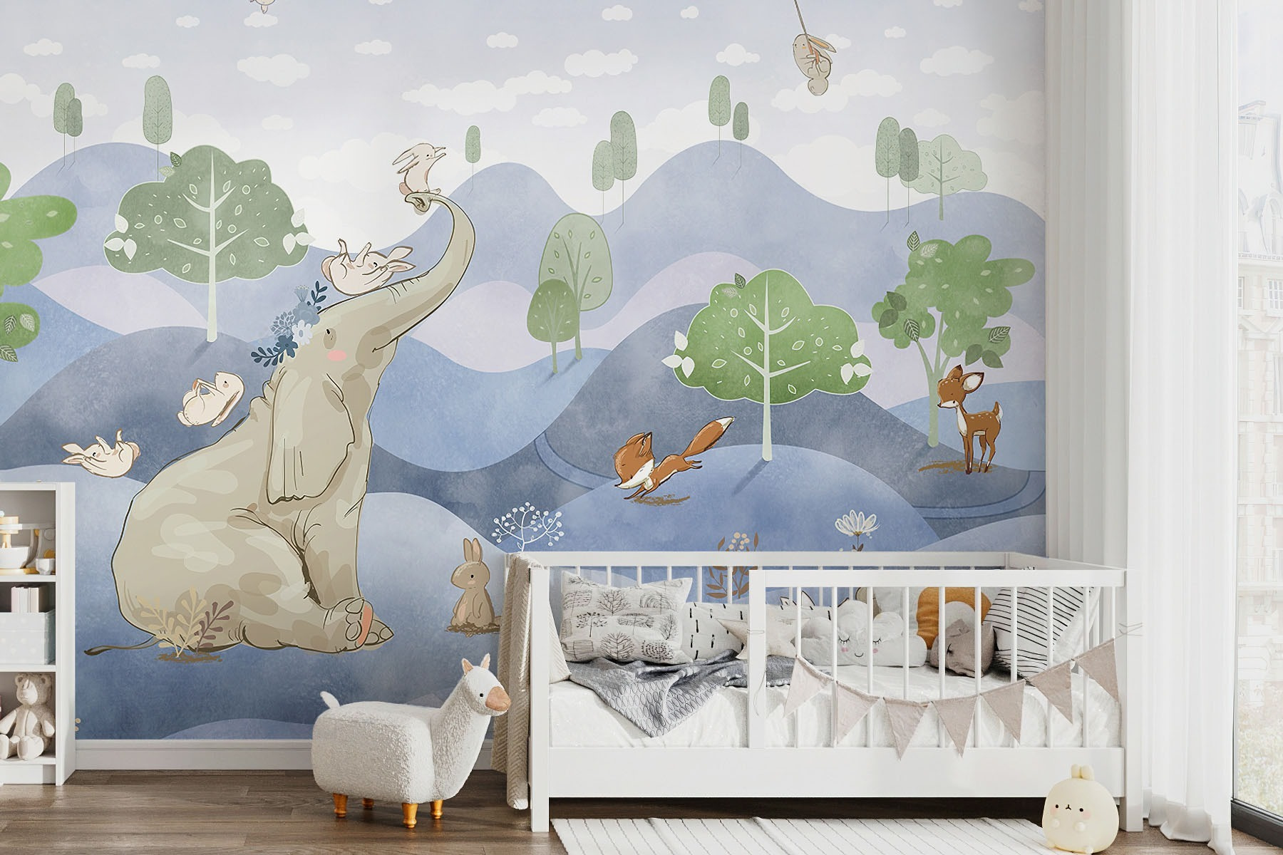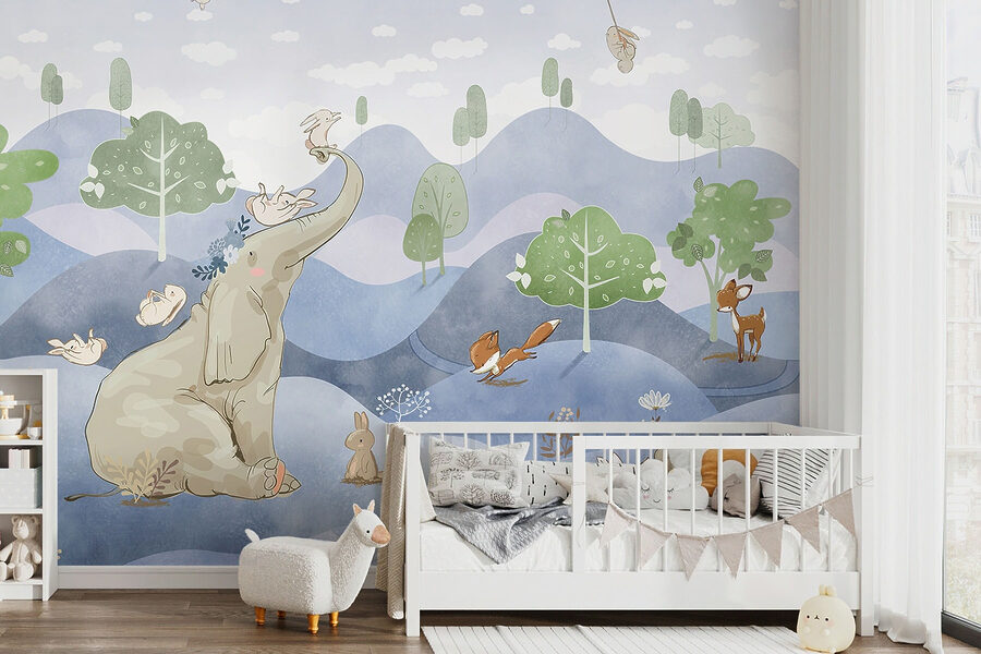 Imaginați-vă transformarea camerei unui copil într-o țară a minunilor capricioasă cu această pictură murală jucăușă. Cu un iepure adorabil care ține în mână o floare, alături de o distribuție veselă de creaturi precum un elefant, o vulpe și o căprioară, este direct dintr-o carte de povești. Culorile pastelate și peisajul de vis aduc un sentiment de calm și bucurie – perfect pentru a stârni imaginația celor mici. Imaginați-vă povești de adormit care prind viață sau după-amiezi leneșe petrecute pierdute în vise cu ochii deschiși. Lăsați această pictură murală să lumineze orice spațiu, creând un paradis magic în care aventura și pacea coexistă.