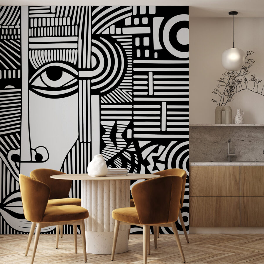 Aceasta nu este doar o pictură murală – este o operă de artă modernă care vă poate transforma complet spațiul. Cu liniile sale complexe în alb și negru care formează o față abstractă, este ca și cum ai avea o capodoperă inspirată de Picasso pe perete, chiar în camera ta de zi. Modelele îndrăznețe și contrastele izbitoare o fac imposibil de ignorat pentru oricine.