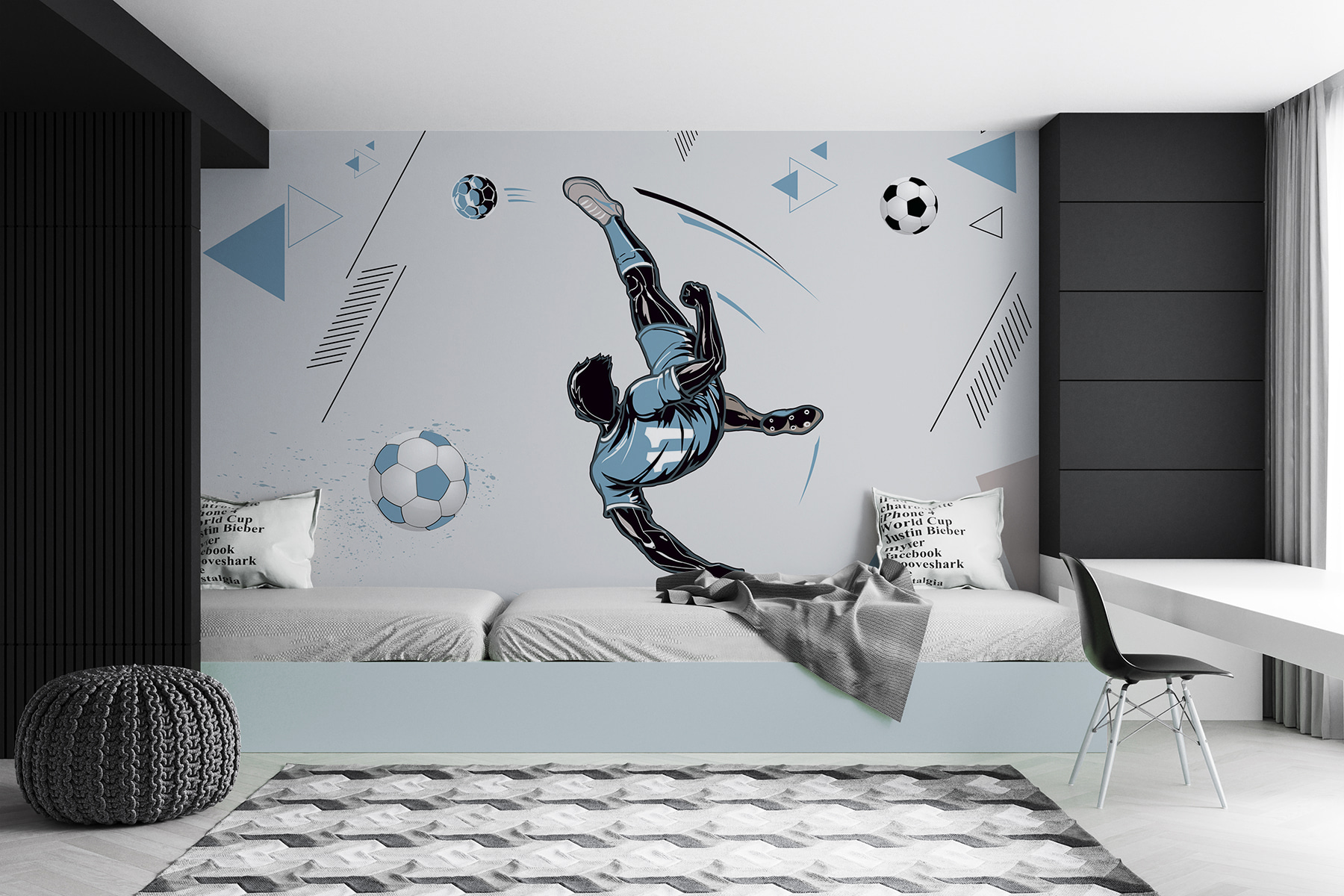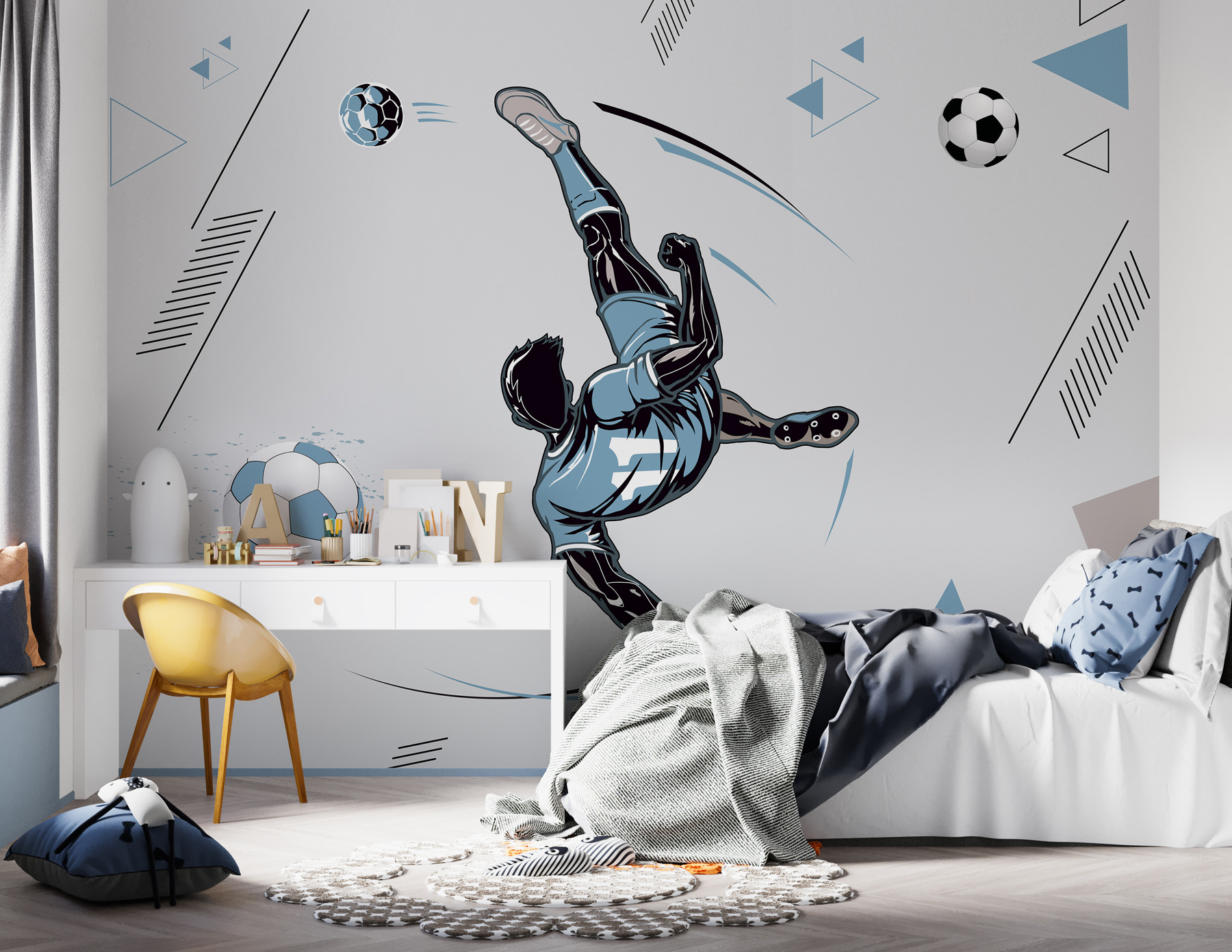 Fie că sunteți un fan înrăit al fotbalului sau pur și simplu iubiți decorul unic, această pictură murală va aduce puncte de stil serioase – haideți, dați pereților dvs. o mică lovitură!